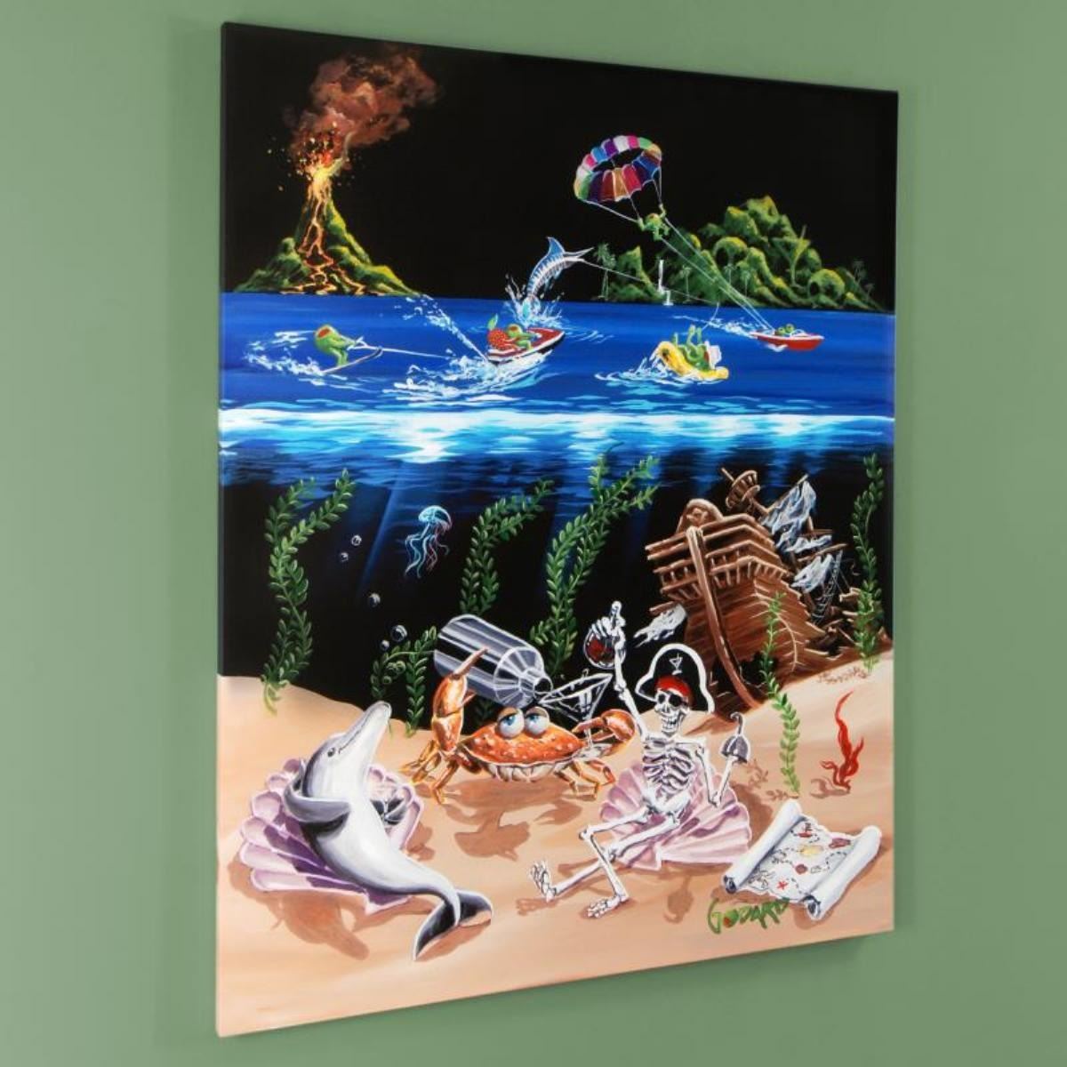 With unforgettable characters and undeniable charm, Michael Godard creates artworks that are sure to be the centerpiece of any room! "Sand Bar 2" is a limited edition, heavily hand-embellished giclee on stretched canvas, numbered out of a mural edition and bears Godard's authorized signature! This piece comes gallery wrapped. Includes Certificate of Authenticity! Measures approx. 42" x 53" (image). *Local pickup is available for this piece.