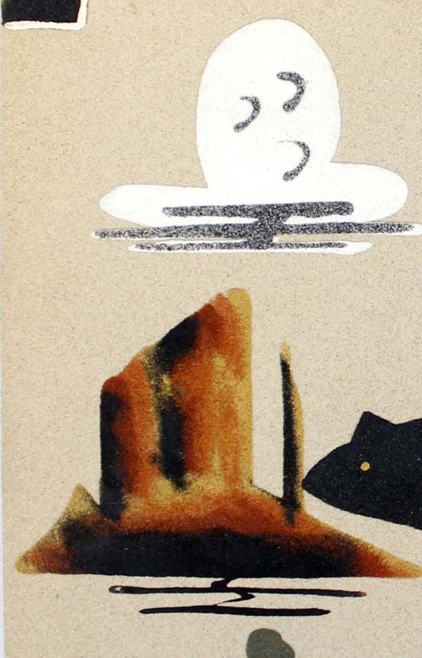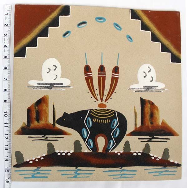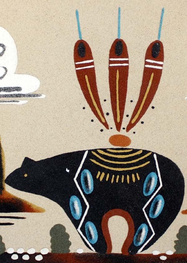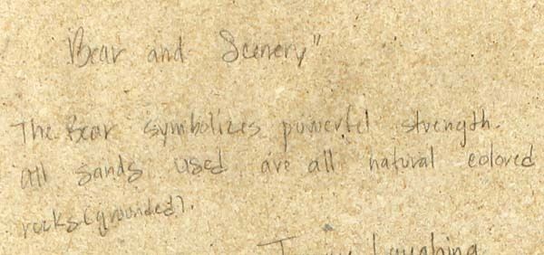 Sand Painting ''Bear & Scenery'' by Tommy Laughing. All colors are from natural ground colored rocks. This wonderful piece measures 16'' x 16''
