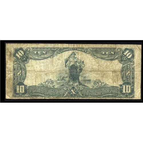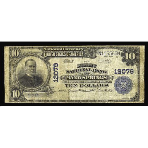 <B>Sand Springs, OK</B></I> - $10 1902 Plain Back Fr. 634 <B>The First NB</B></I> Ch. # 12079<BR>A new to the census piece from the only bank chartered in this Tulsa suburb. While notes from this interestingly named community are hardly rare, most listed in the census (and almost all we have seen offered in recent years) have been dreadfully low grade specimens, many with serious problems. This example is a happy exception, as it is well circulated but decently margined and otherwise problem free for the grade. <B>Very Good-Fine.</B></I>