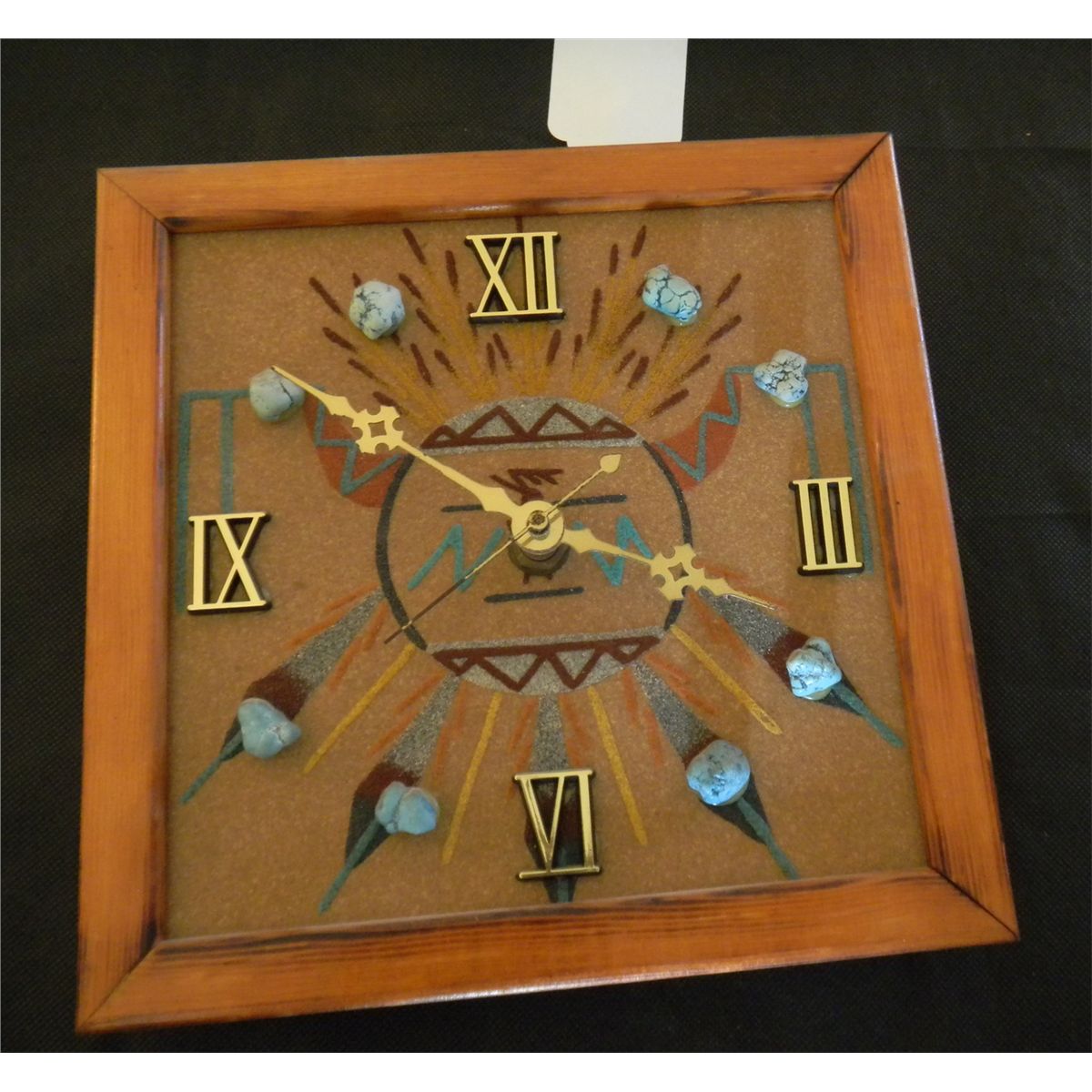 Battery operated sand painted turquoise studded clock - Size is 8 1/2"x 8 1/2" x 1 1/2" Shipping $20.00