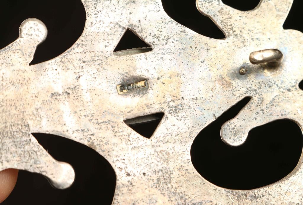 Openwork sterling scroll with rope motif holds a 1 1/2" oval turquoise cab. Marked 'P Chee' and measures 2 1/2" x 3". Turquoise has vertical crack.