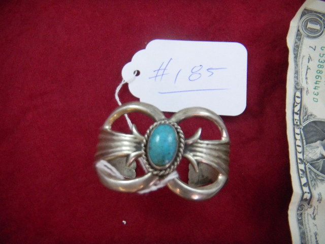 Sandcast Navajo Bracelet with large turquoise cabochon stone, sterling silver, The opening is approximately 1 inch and 2 and one quarter inches in diameter. Shipping $14.50. Condition is fine
