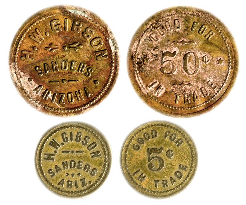 Two tokens: obverse: H.W. Gibson / Sanders / Ariz.; reverse: Good For / 5c, 50 / In Trade. Br, 21, 30mm, R7,R9. Fine condition.