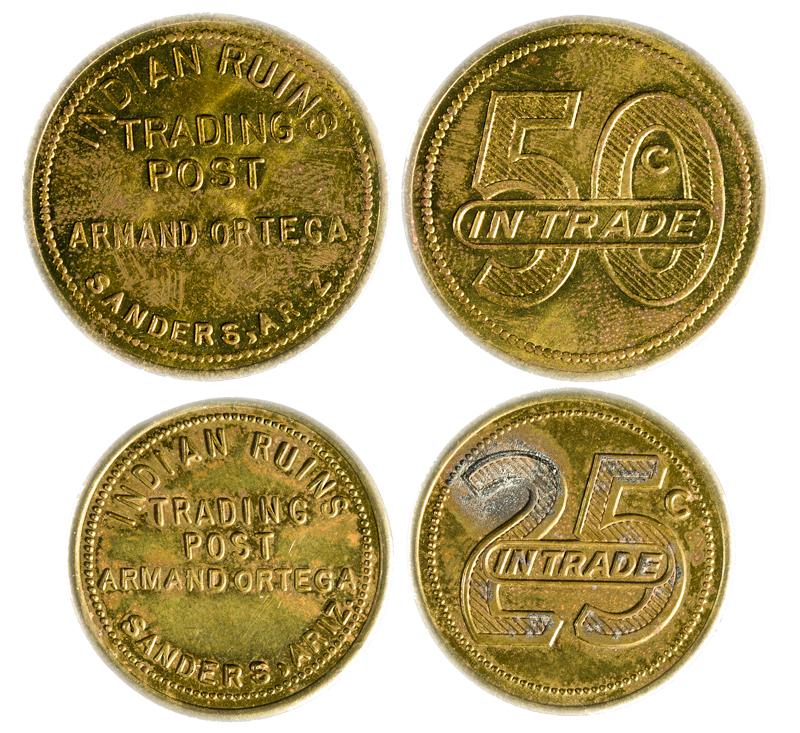 Two tokens: obverse: Indian Ruins / Trading / Post / Armand Ortega / Sanders, Ariz.; reverse: 25,50c / In Trade. Br, 28,32mm, R3. Very good condition, 25c piece has carbon spot on reverse.