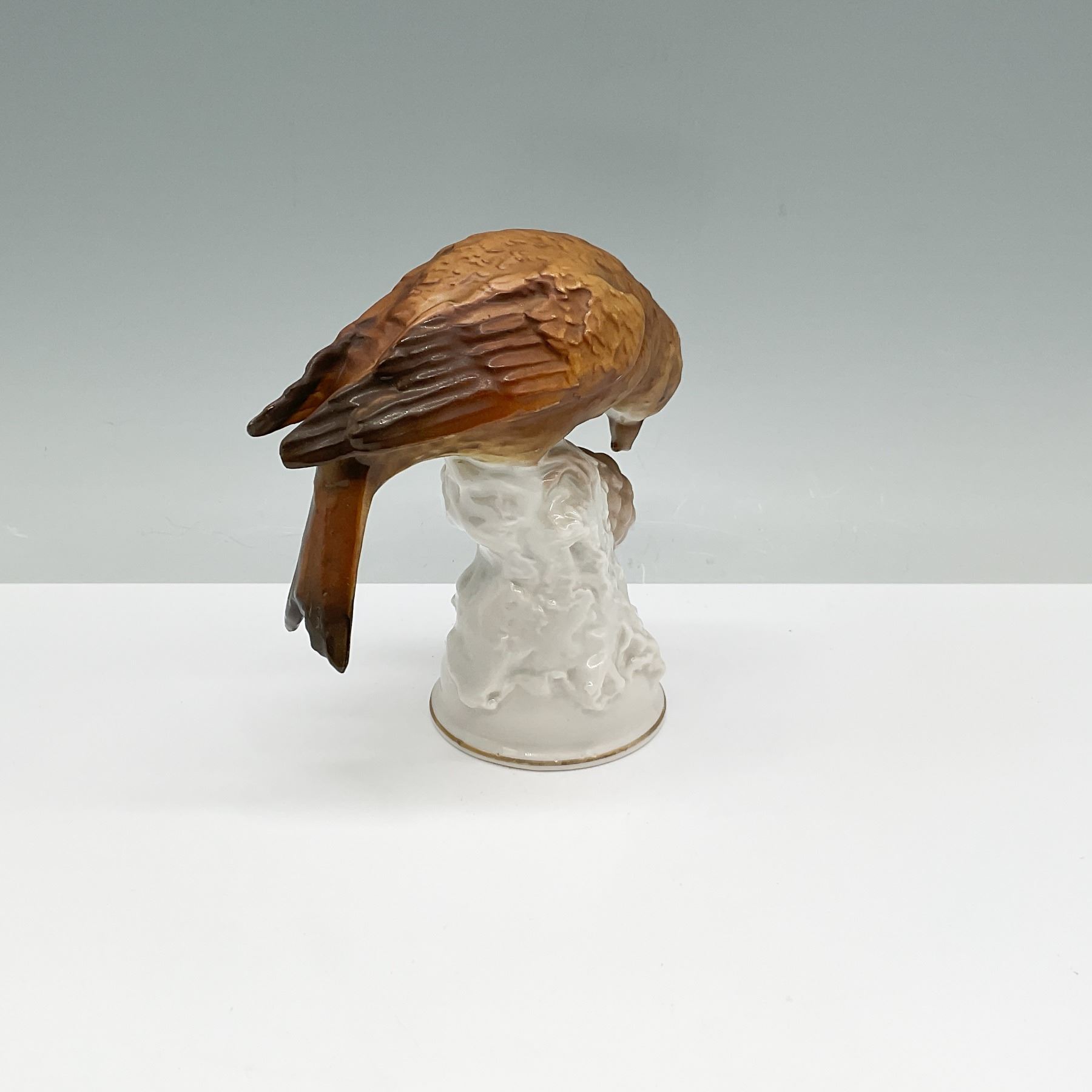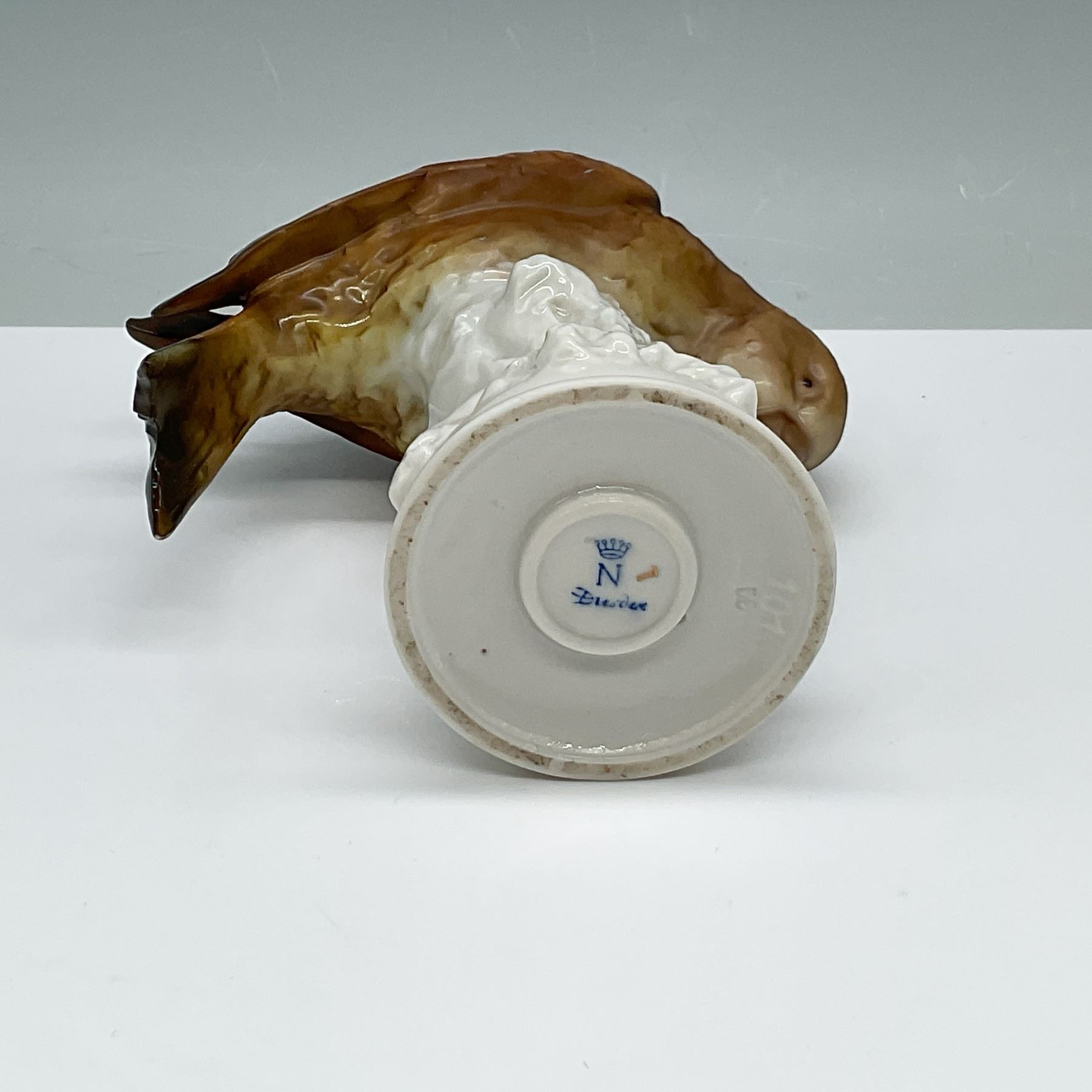 A finely crafted Sandizell porcelain bird figurine featuring a beautifully hand-painted brown bird perched on a naturalistic base. The figure displays exquisite detail, from the intricate feather texture to the life-like posture. The base bears the Sandizell crown and N backstamp, signifying the craftsmanship associated with this renowned Dresden porcelain manufacturer.