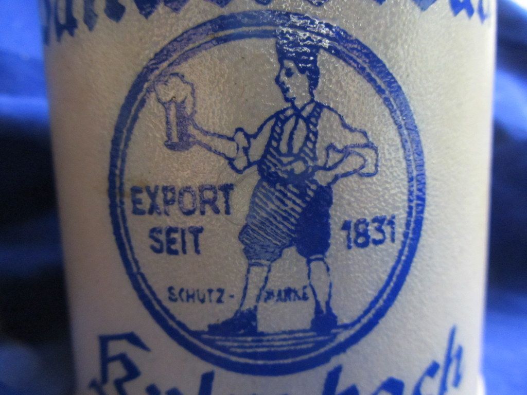 German Sandlerbräu Kulmbach beer mug has the trademark used during WWII on the front. This mug is an old piece. It holds 0.5L rough salt finish 5" tall x 3 1/8" across opening x 3.75" across base. NOTE: it has a hairline fracture from top of the mug to the bottom of where the handle mounts to mug. It does drip slowly (see images for details).