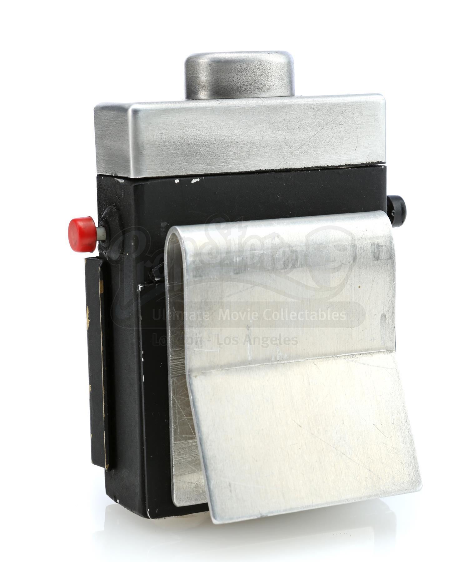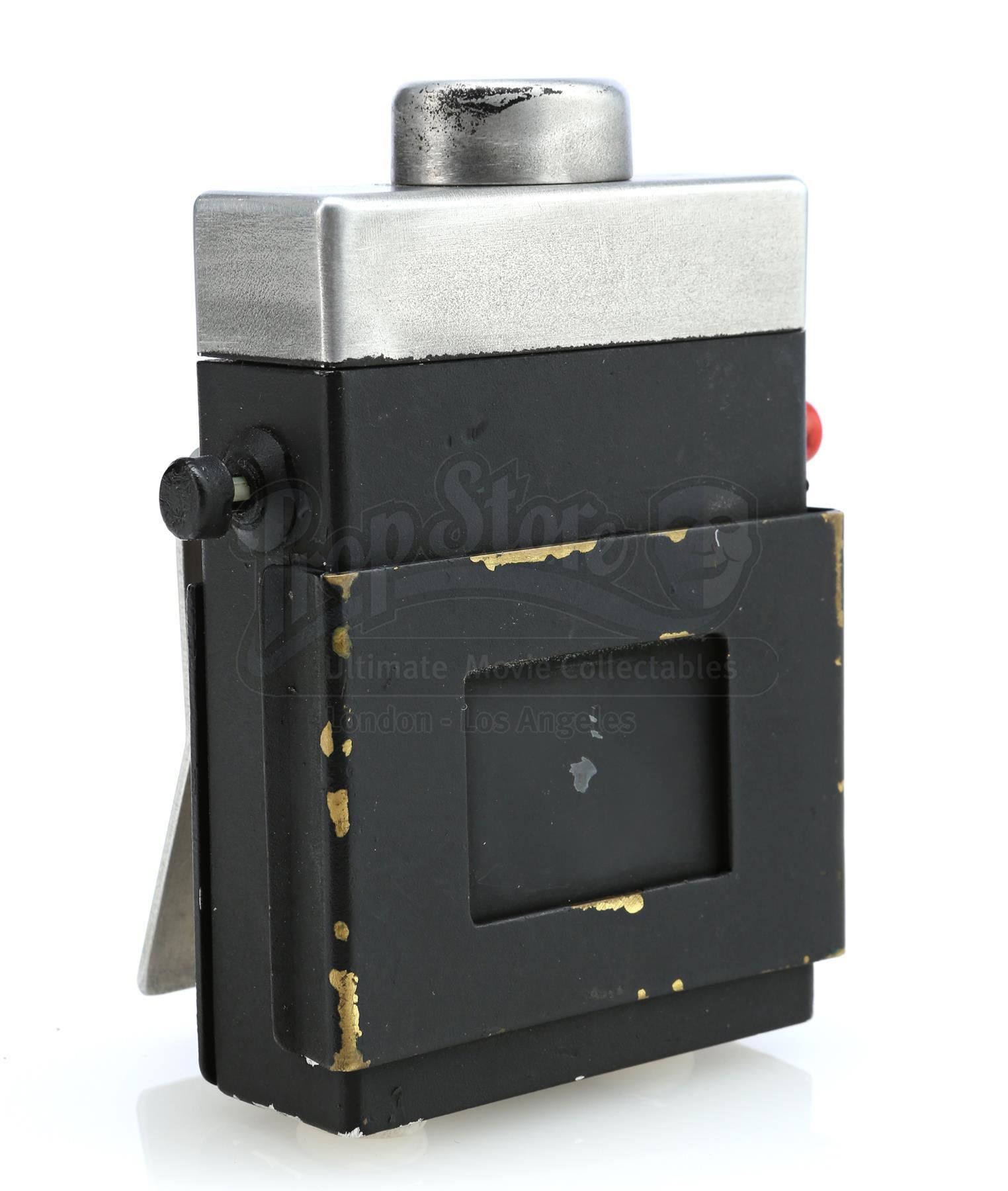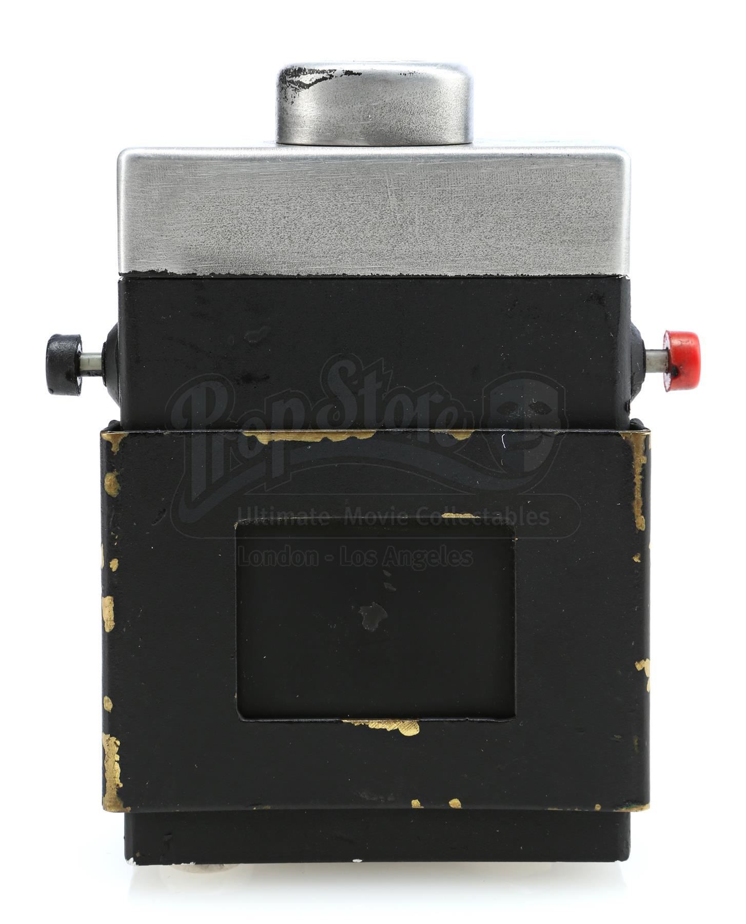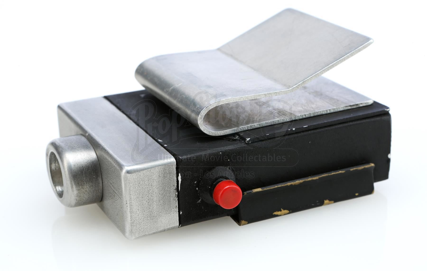 A Sandman hero tracking device from the 1970s sci-fi television series Logan’s Run. The hand-painted device consists of a black metal base with a steel belt clip, a glass lightbulb inset into a hole at top, a brass clip affixed at front, two practical red and black plastic buttons affixed to the sides, and ‘MGM’ carved into the bottom, referring to MGM Television, the production company behind the series. The device is in very good, production-used, vintage condition overall.
