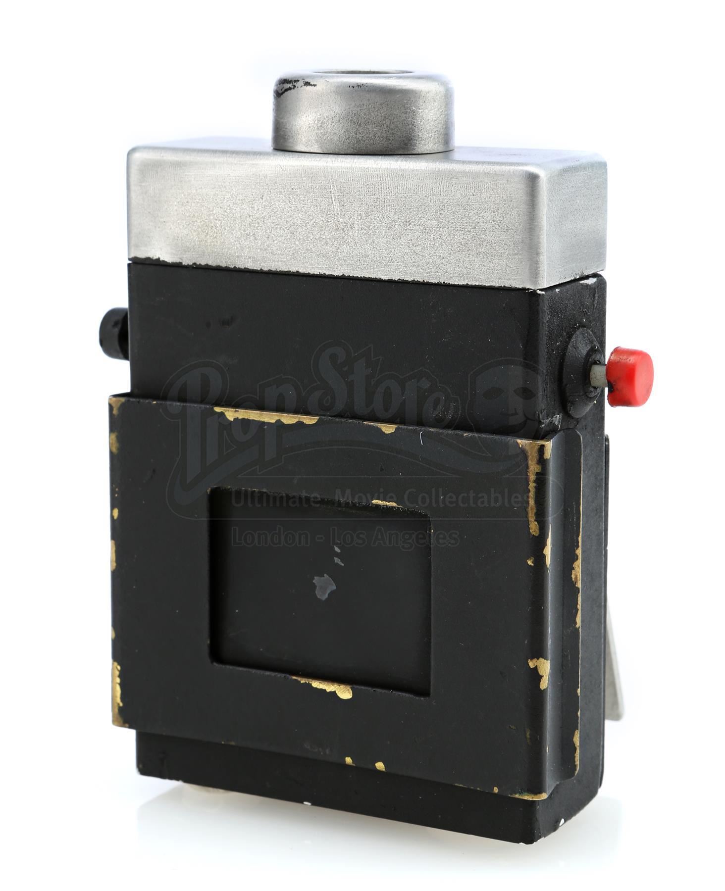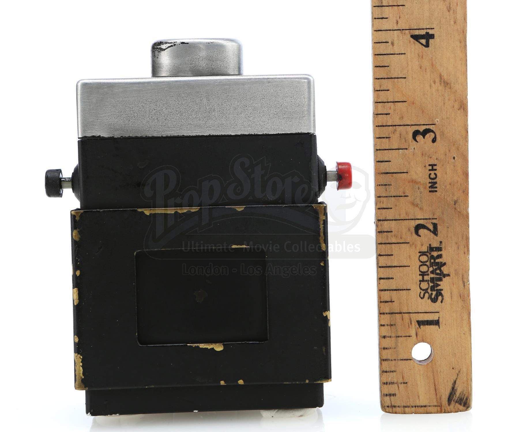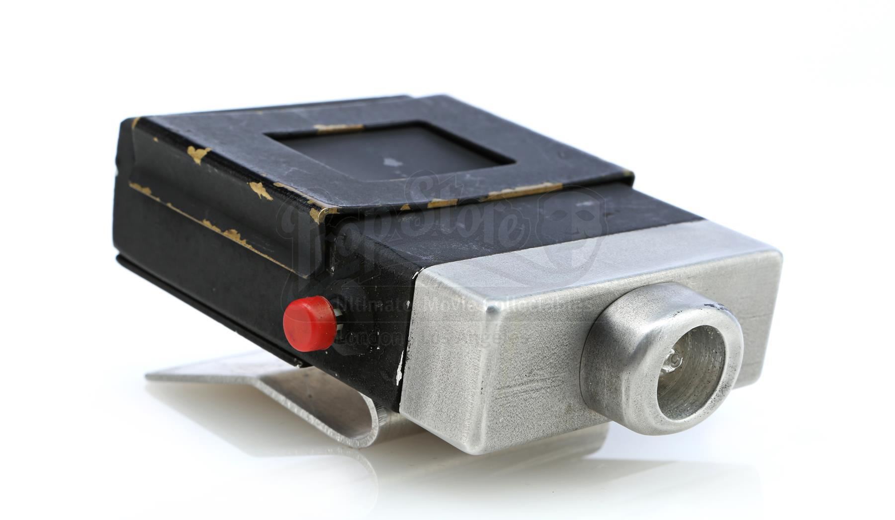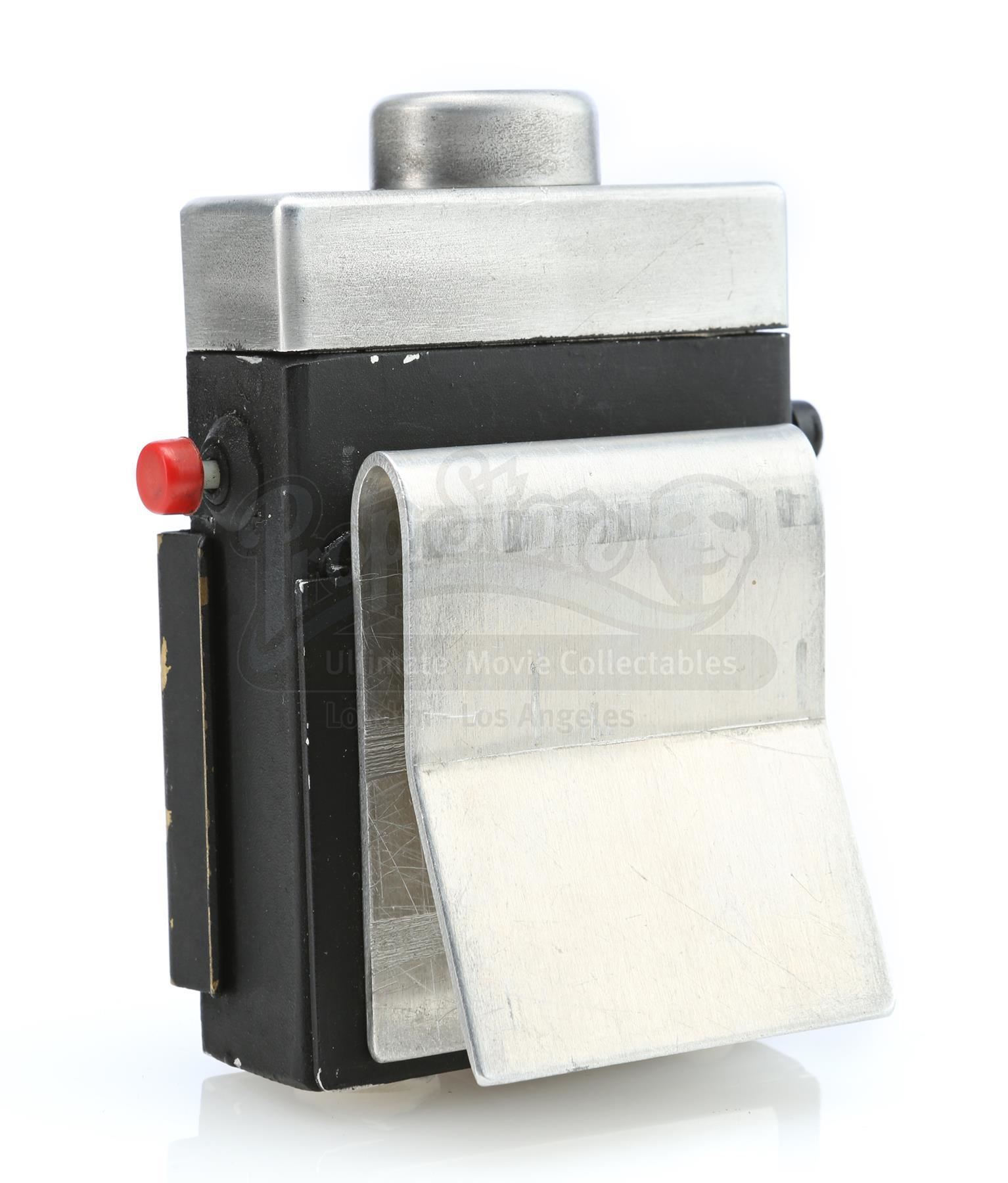 A Sandman hero tracking device from the 1970s sci-fi television series Logan’s Run. The hand-painted device consists of a black metal base with a steel belt clip, a glass lightbulb inset into a hole at top, a brass clip affixed at front, two practical red and black plastic buttons affixed to the sides, and ‘MGM’ carved into the bottom, referring to MGM Television, the production company behind the series. The device is in very good, production-used, vintage condition overall.