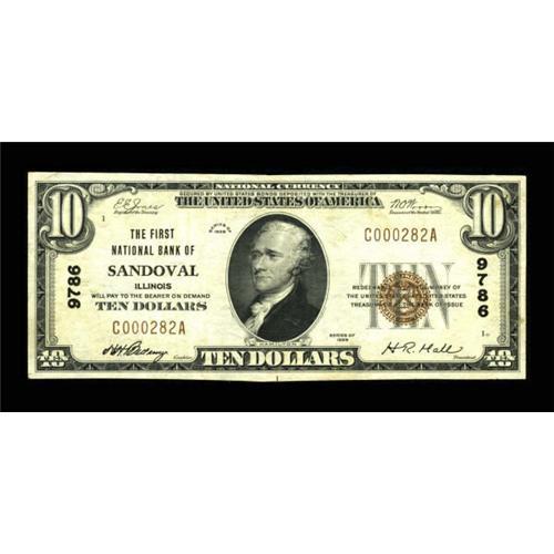 <B>Sandoval, IL</B></I> - $10 1929 Ty. 1 <B>The First NB</B></I> Ch. # 9786<BR> Some embossing still remains on this brightly inked example. <B>Very Fine-Extremely Fine</B></I>.<BR><I>From The Kansas City Collection.</B></I><BR><BR><b>Shipping:</b> Coins & Currency (<a target="_blank" href="http://www.heritageauctions.com/common/shipping.php">view shipping information</a>)