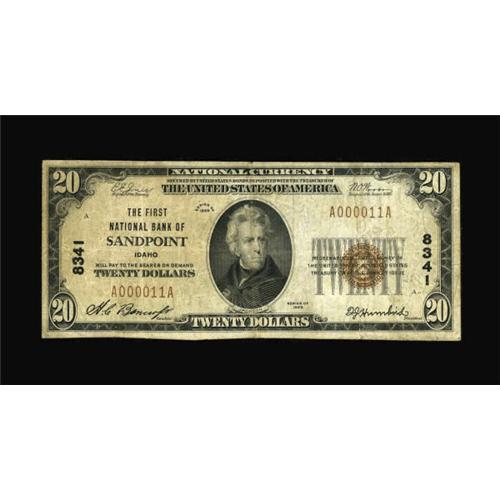 <B>Sandpoint, ID</B></I> - $20 1929 Ty. 1 <B>The First NB</B></I> Ch. # 8341<BR> This small Bonner County community was home to two issuing banks, with this institution lasting only until 1932. Both banks are quite scarce, with our records showing just seven offerings in the past forty years, the last of which came in a 2006 Bowers sale in which a very much lower grade small example realized almost $4000. This specimen is considerably nicer and should easily eclipse that figure early in the bidding. <B>Fine-Very Fine.</B></I><BR><BR><b>Shipping:</b> Coins & Currency (<a target="_blank" href="http://www.heritageauctions.com/common/shipping.php">view shipping information</a>)