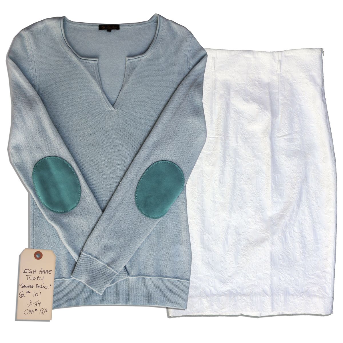 Sandra Bullock screen-worn hero wardrobe from the inspiring 2009 drama ''The Blind Side.'' Bullock won her Best Actress Oscar playing Leigh Anne Tuohy in the true story about a family that took in a homeless boy. Their charge eventually became a star NFL player. Two-piece ensemble comprises (1) a light azure cashmere sweater by Loro Piana with fine teal suede elbow patches in size 42 and (2) white floral pattern skirt by Catherine Malandrino in size 6. Near fine. With wardrobe department's tag and a COA from Premiere Props.
