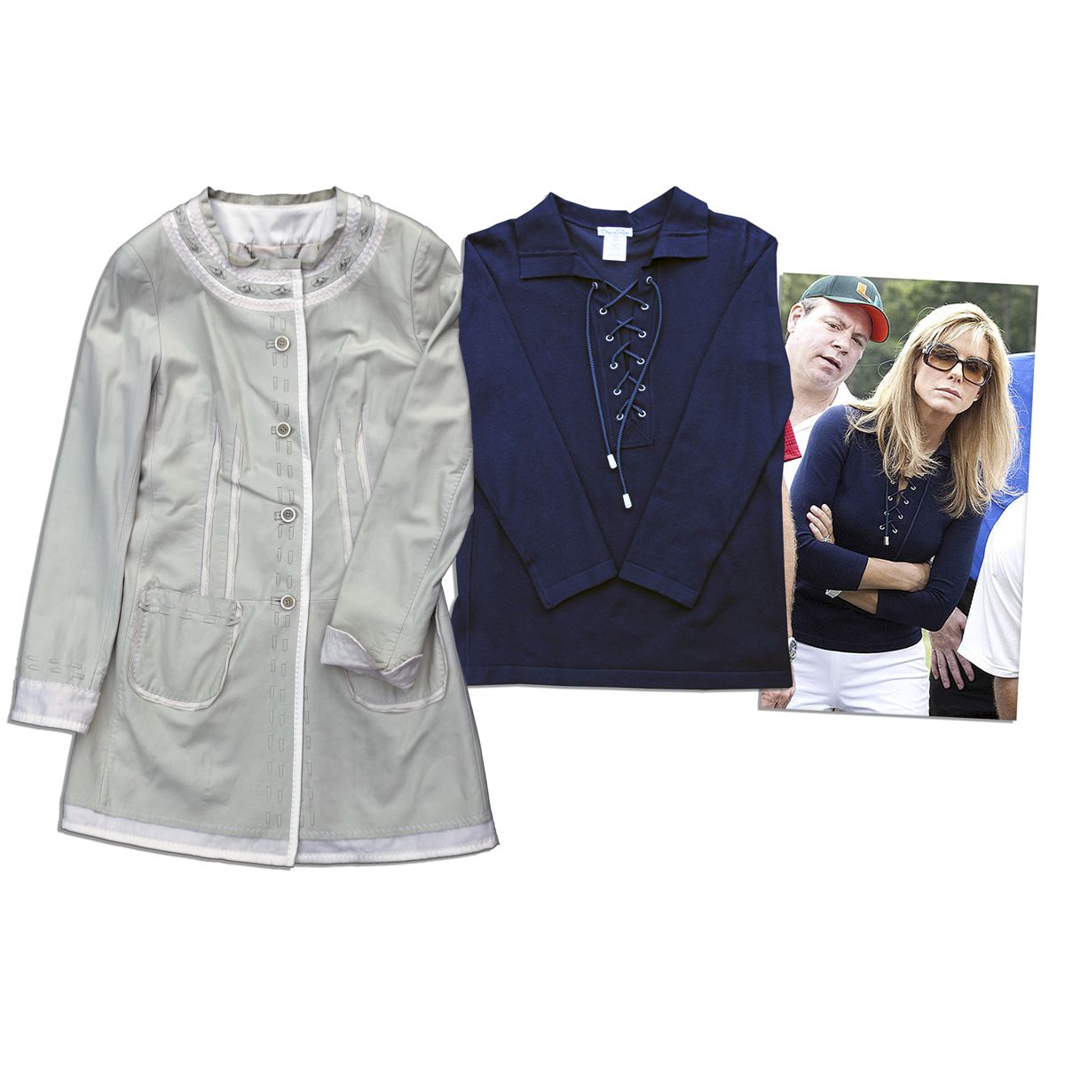 Sandra Bullock screen-worn wardrobe from ''The Blind Side'', the 2009 performance that garnered her the Best Actress Oscar. Bullock played Leigh Anne Tuohy in the inspiring true story about a homeless boy taken in by a wealthy family, who later becomes a star NFL player. Two-piece ensemble comprises an off-white leather jacket by Elie Tahari and a stretchy navy blue shirt by Oscar de la Renta in size XS. Near fine. With a Premiere Props COA.