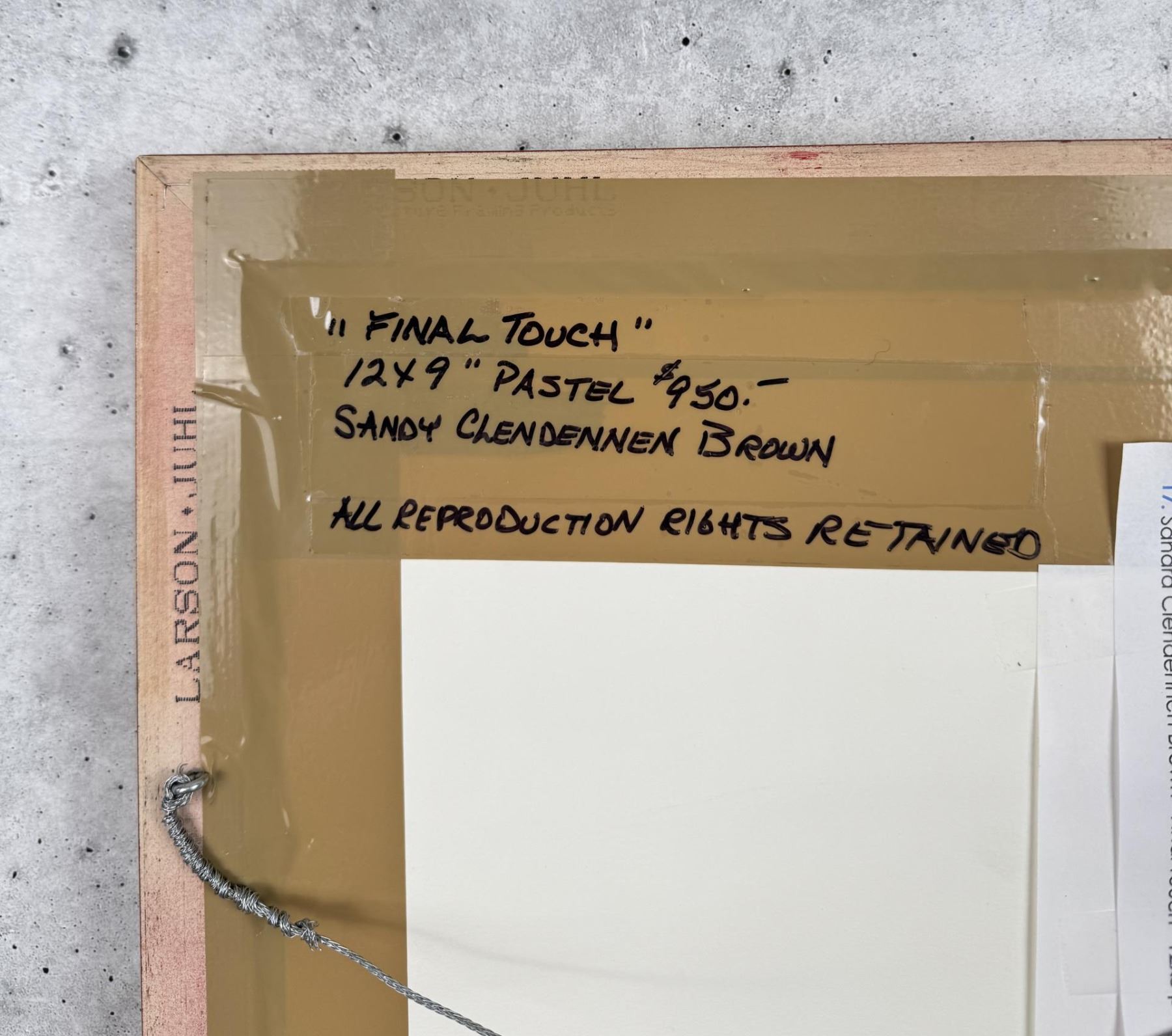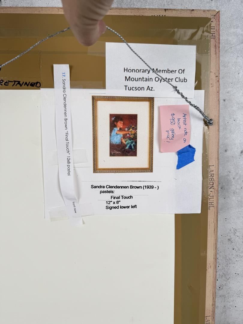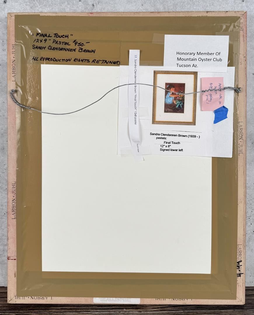 Title is Final Touch. 9" by 12" unframed. 17 3/4" by 21 7/8". Sandra Clendennen (Born 1939) is active/lives in Arizona. Sandra Clendennen is known for Cowboy genre, wildlife.