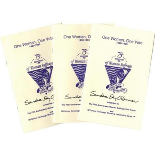 <B>Sandra Day O'Connor: Three Copies of "One Woman, One Vote" Pamphlet Signed</B></I>, 5.5" x 8.5", 20 pages, illustrated. All are signed "<I>Sandra Day O'Connor</B></I>" on the front cover. Very fine.<BR><BR><b>Shipping:</b> Flat Material, Small (<a target="_blank" href="http://www.heritageauctions.com/common/shipping.php">view shipping information</a>)
