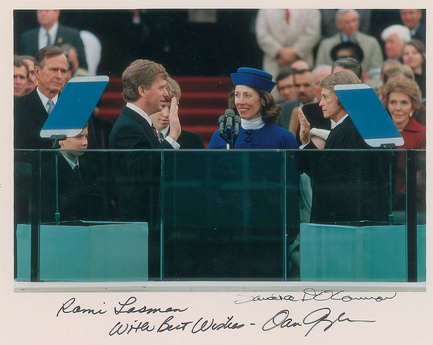 Color satin-finish 10 x 8 photo of Quayle reciting the vice president's oath of office, which was administered at his special request by Supreme Court Justice Sandra Day O'Connor, signed and inscribed in the lower border in black felt tip, "Rami Lasman—with best wishes—Dan Quayle" and "Sandra Day O'Connor.” In fine condition.