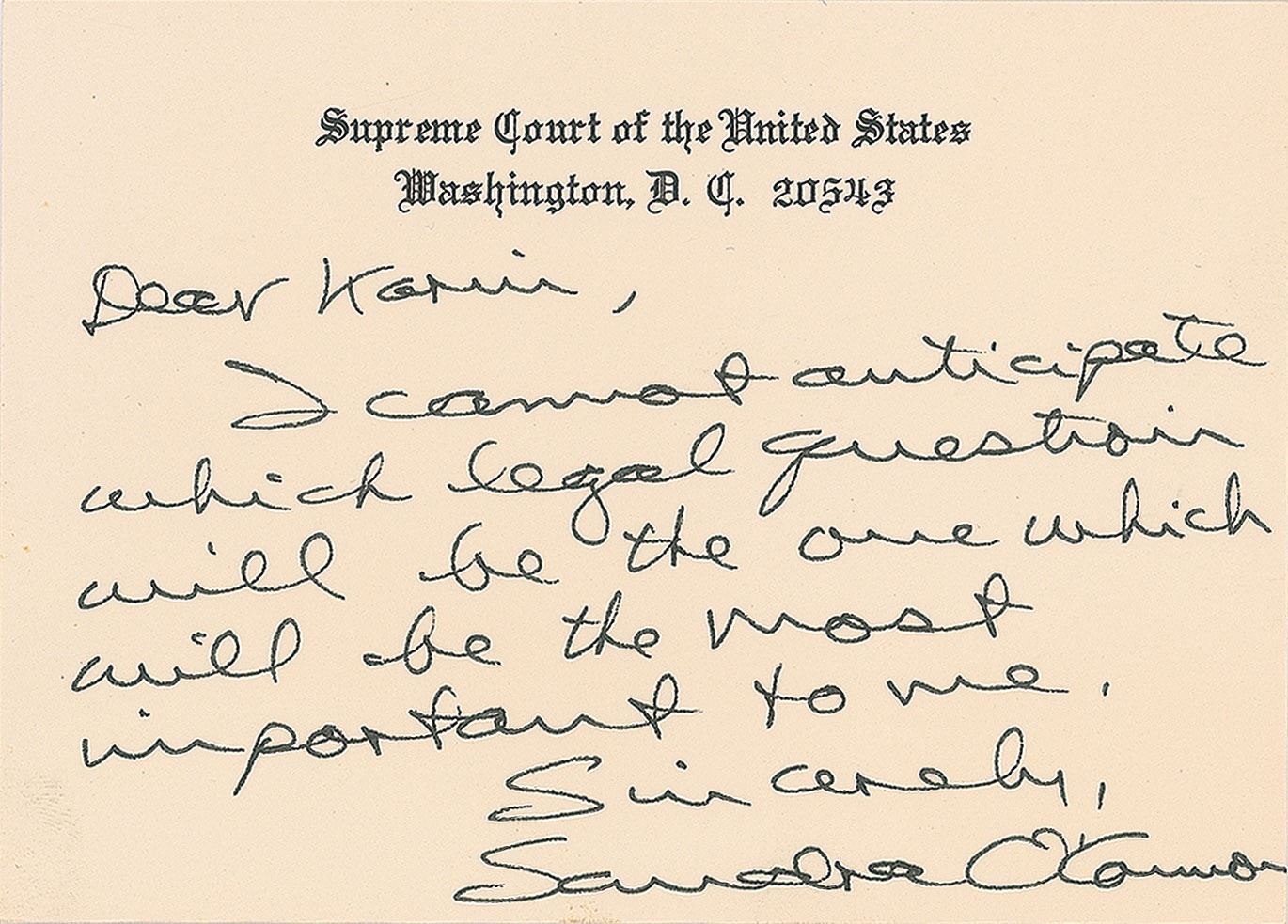 ALS signed “Sandra O'Connor,” one page on a 5 x 3.5 Supreme Court card, no date. Letter to "Karin," in full: "I cannot anticipate which legal question will be the one which will be the most important to me." In fine condition.