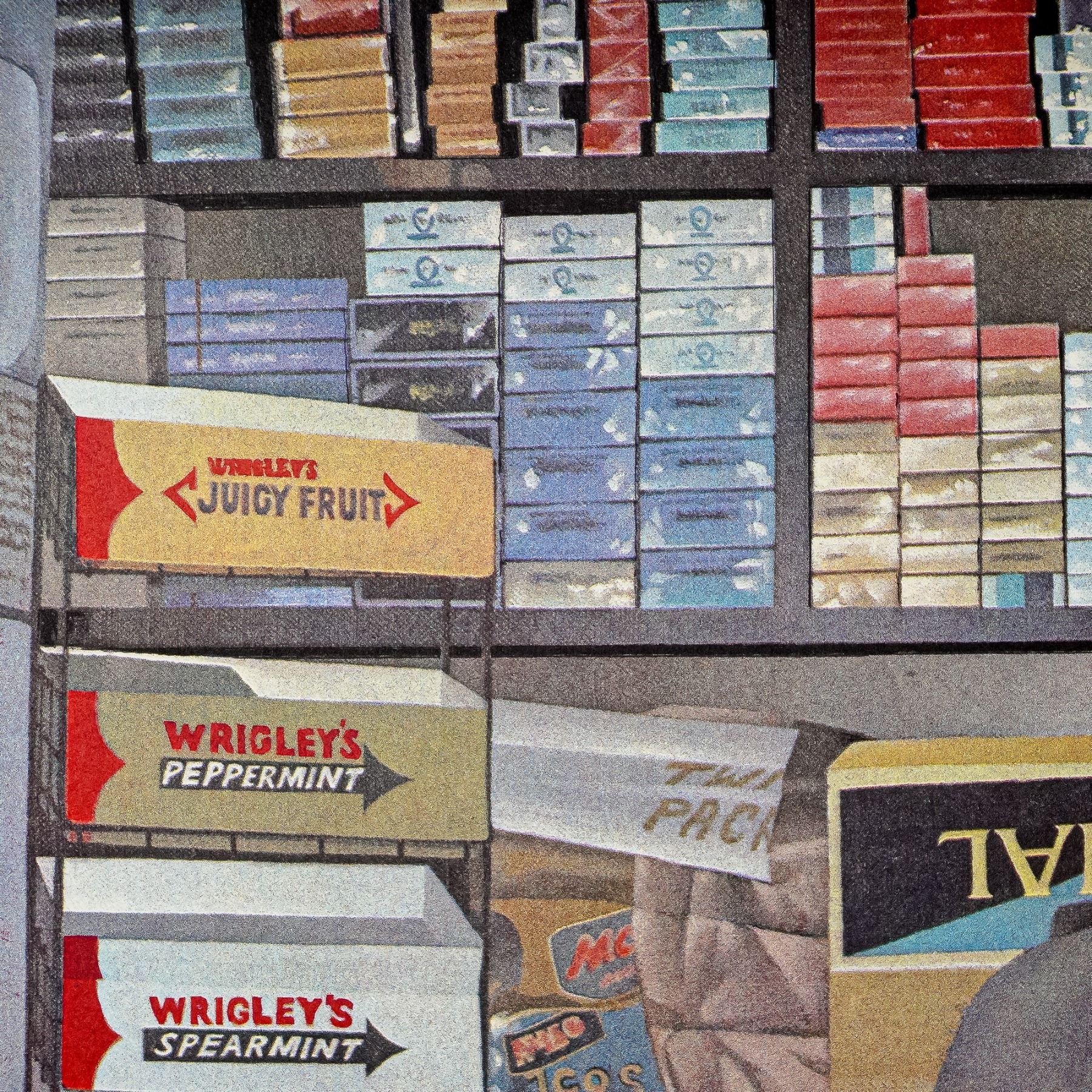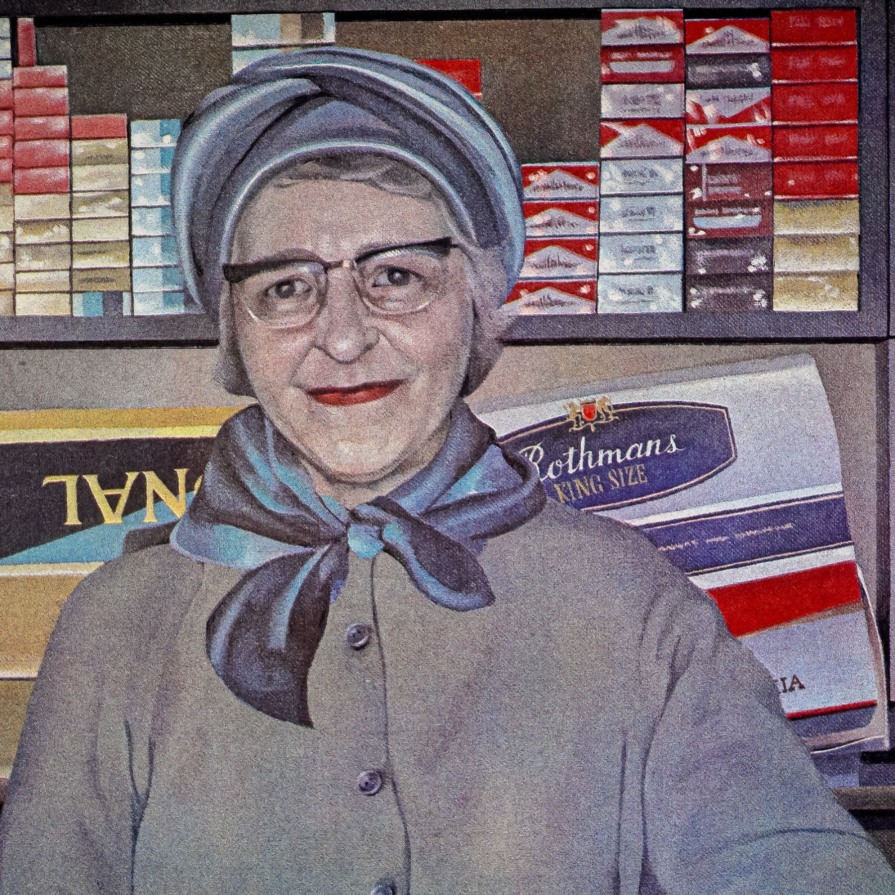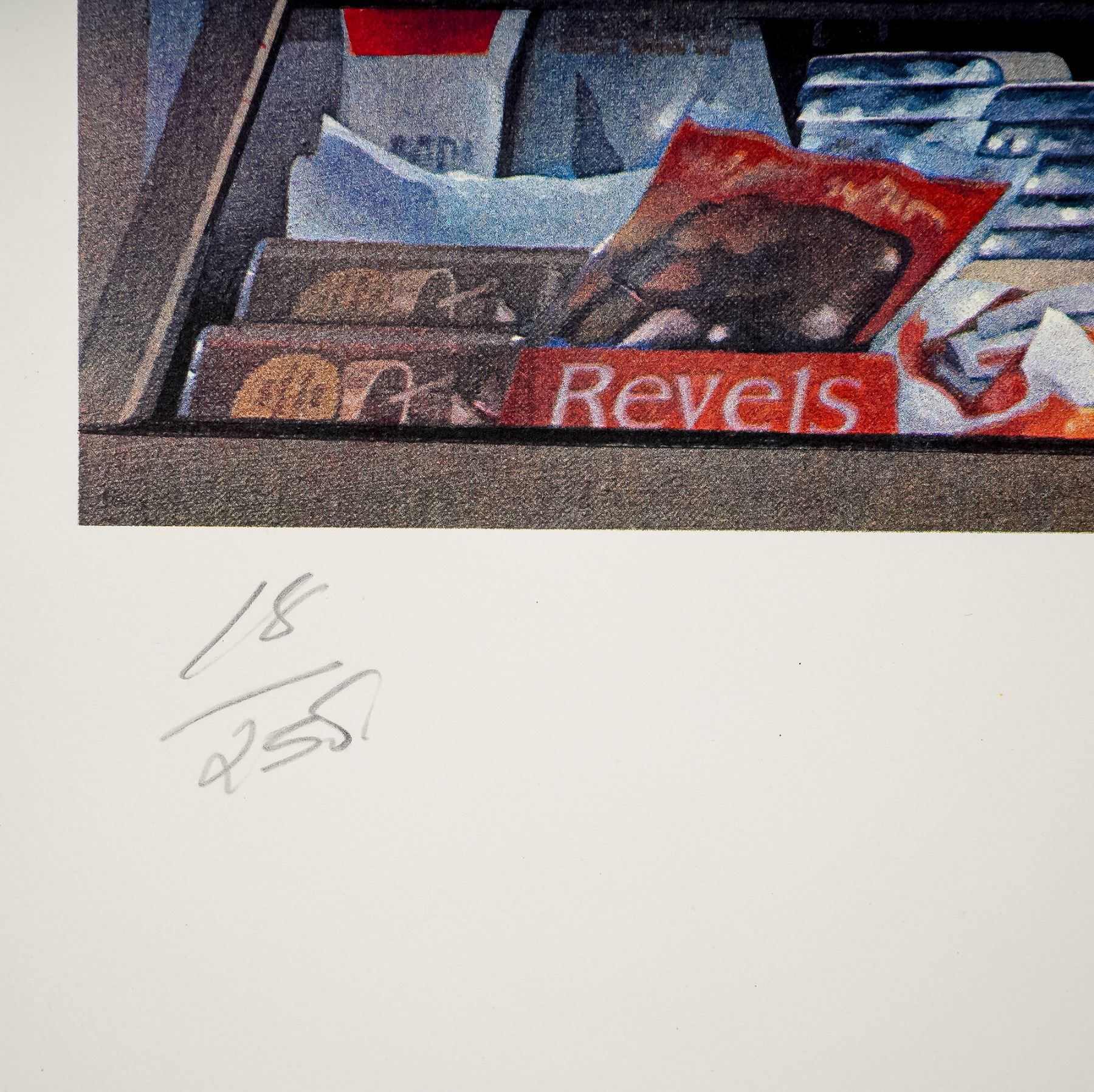 A vibrant and nostalgic work by Sandra Lawrence, Lady Leicester Square captures the quintessential charm of a traditional British kiosk. Overflowing with iconic confectionery brands, Toblerone, Wrigley's, Cadbury, and Revels, this detailed lithograph places the viewer directly in front of the smiling shopkeeper, evoking the warmth and familiarity of mid-20th century London life. Sandra Lawrence's meticulous attention to commercial imagery and her ability to blend everyday scenes with artistic resonance ensure this print remains both historically evocative and visually compelling. A delightful blend of Pop Art sensibility and social realism, this work stands as a testament to Lawrence's reputation for capturing urban nostalgia with wit and warmth. This limited edition lithograph is numbered 18/255, making it a rare collector's piece. The signature in pencil at the lower margin confirms its authenticity, while the low edition number enhances desirability among collectors.