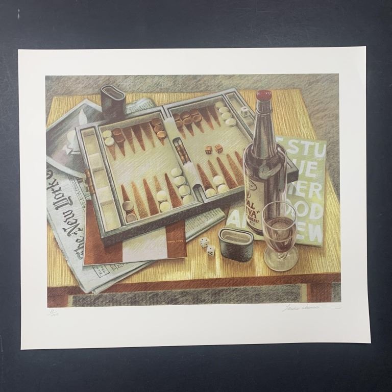 Sandra Lawrence's "Backgammon" limited edition print, signed lower right, and numbered 69/250 lower left. This piece is of a backgammon board, "The New York Times" newspaper, a pair of die, and a glass of alcohol. This piece is in great condition.
