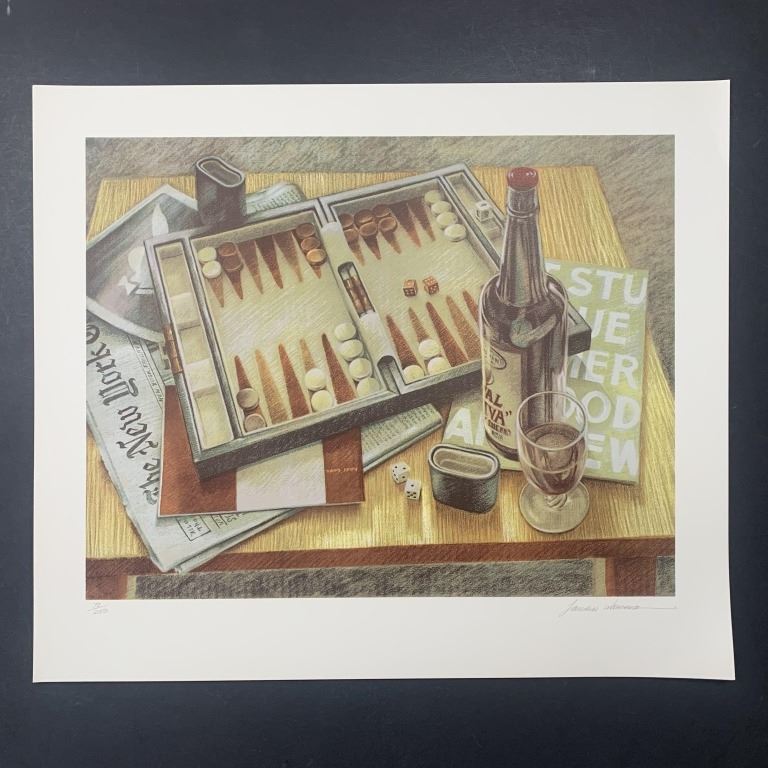Sandra Lawrence's "Backgammon" limited edition print, signed lower right, and numbered 70/250 lower left. This piece is of a backgammon board, "The New York Times" newspaper, a pair of die, and a glass of alcohol. This piece is in great condition.