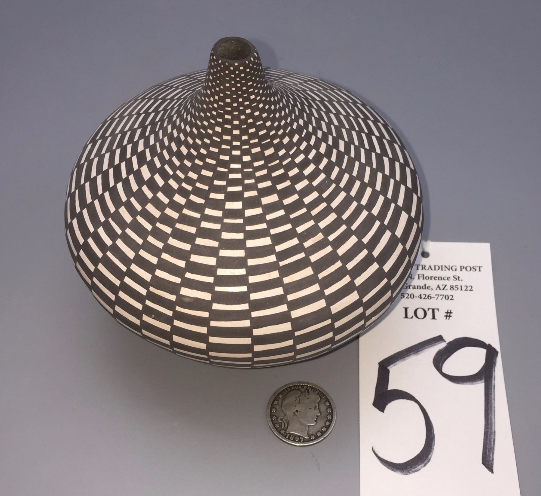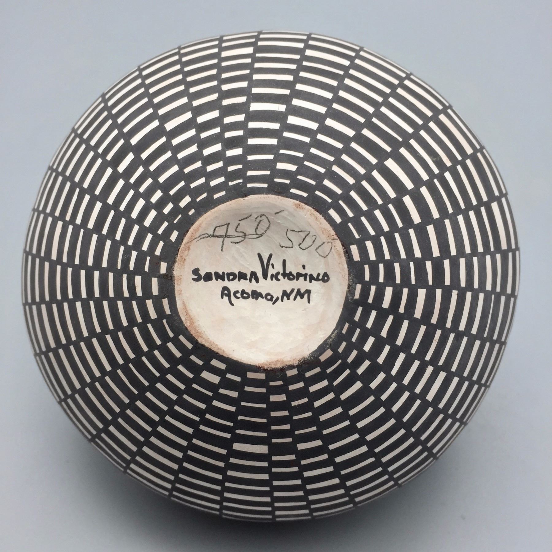 Maker: Sandra Victorino. Approx. Age: Fairly modern. Size: Measures 4 1/2” w x 4 1/2” h. Additional Info: Very fine Acoma Pueblo pot by Sandra Victorino. Condition: Good. Normal wear expected. Please look closely at the pictures - they are an important part of our description. Shipping: There will be a $8 handling / packaging fee for shipping this lot. The actual cost of postage will be added on top of that.