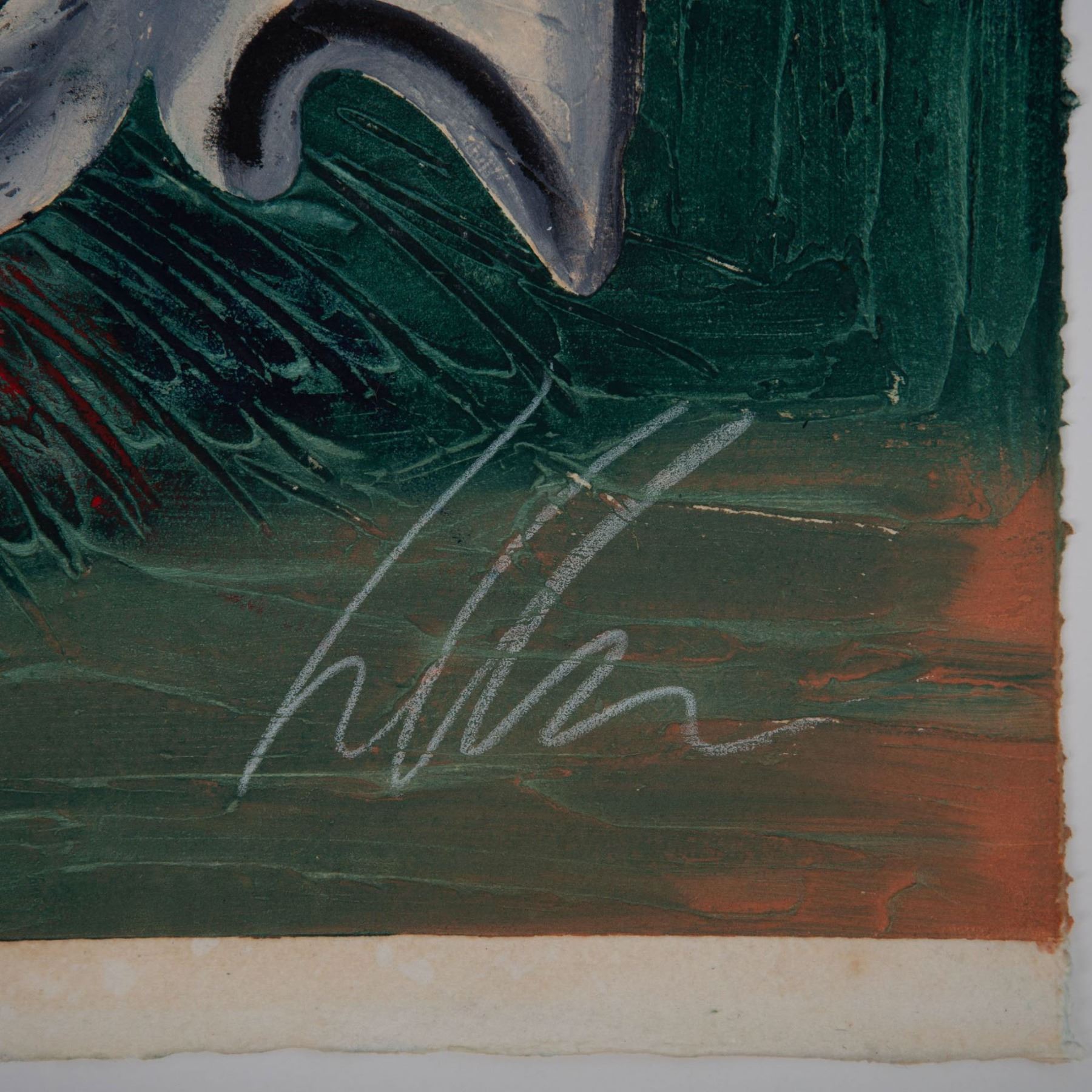 This exquisite carborundum etching with vibrant hand coloring is printed on handmade paper by renowned Italian artist Sandro Chia, a pivotal figure in the Transavanguardia movement of the late 20th century. This artwork is part of the Ten Masterprints portfolio, showcasing a limited edition of 50 prints, of which this piece is number 4. The artist's signature is prominently displayed on the lower right corner. Chia's work is celebrated for its dynamic interplay of color and form, blending figurative and abstract elements that evoke movement and emotion. This etching captures the essence of his artistic legacy, making it a valuable addition for collectors and admirers of contemporary Italian art.