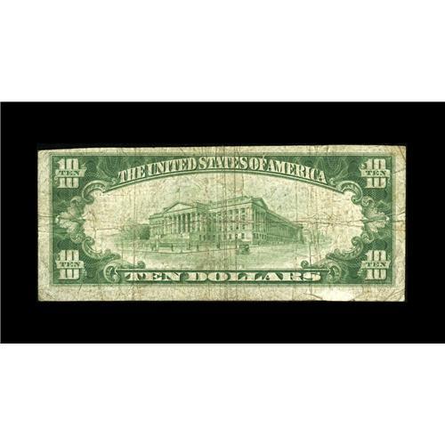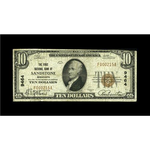 <B>Sandstone, MN</B></I> - $10 1929 Ty. 1 <B>The First NB</B></I> Ch. # 9464<BR>Nine small size notes are reported from this one bank town. <B>Very Good+,</B></I> with no mentionable problems.