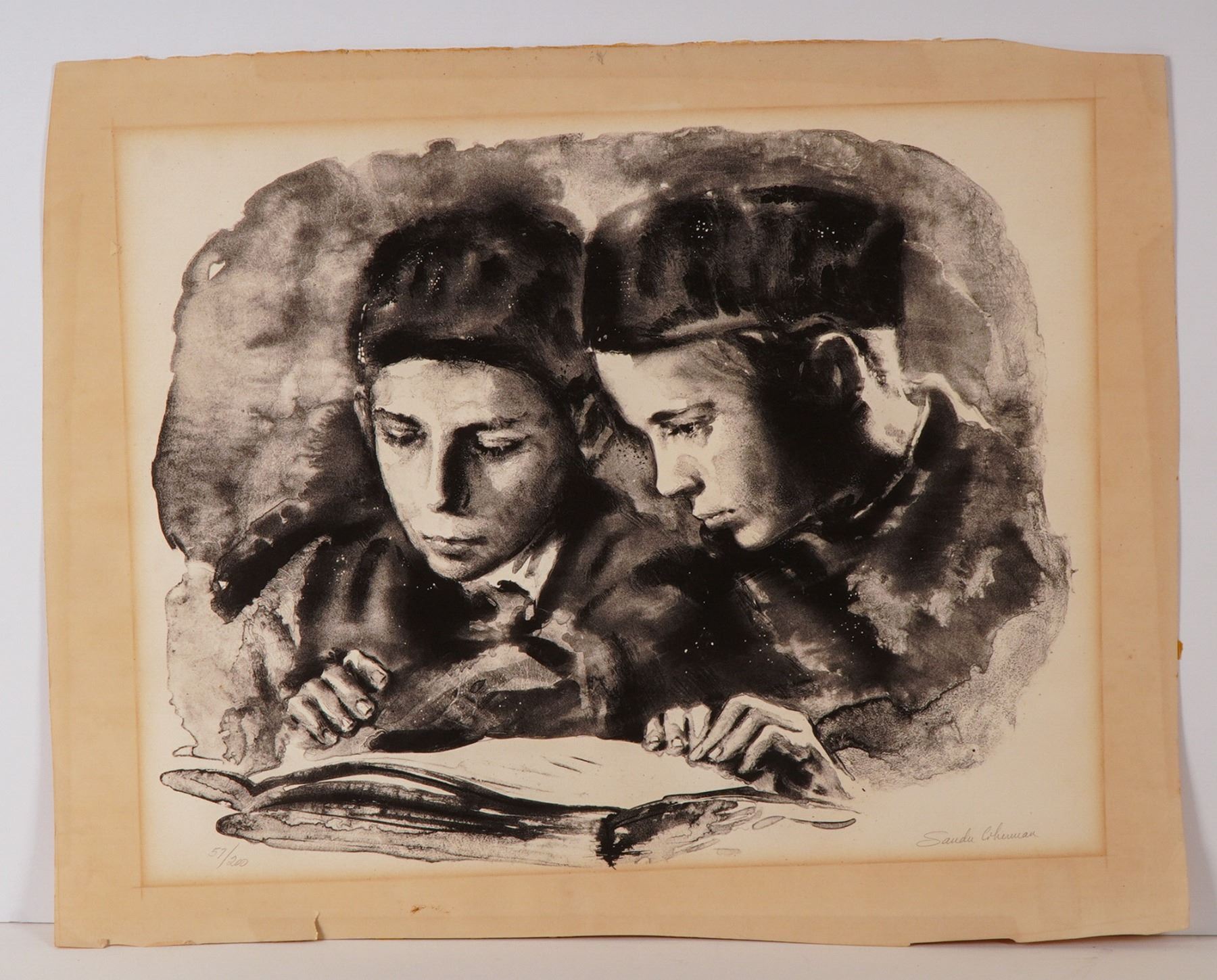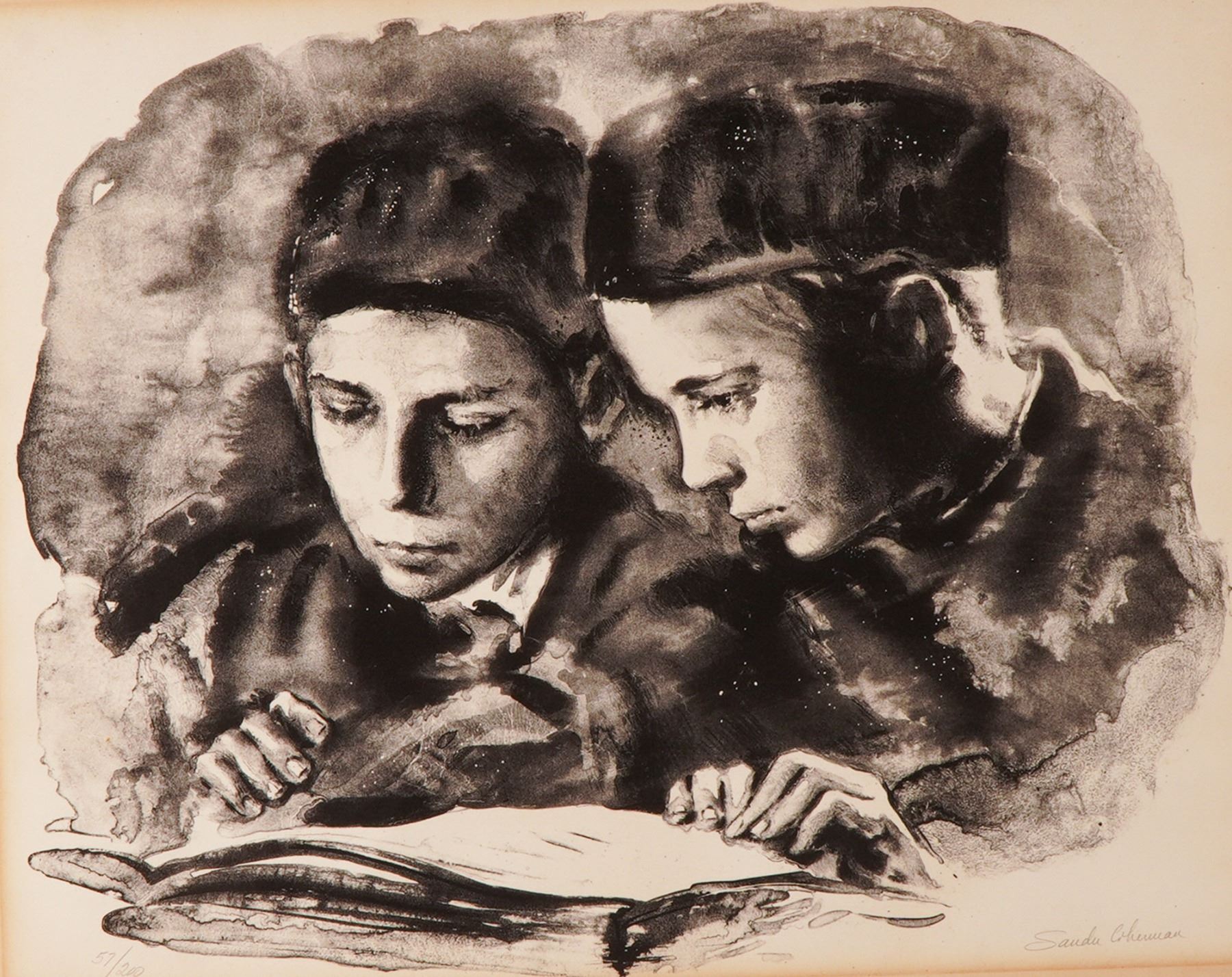 Sandu Liberman' s Reading at Shul is an evocative lithograph on paper that captures two young boys deeply absorbed in study, their faces illuminated with quiet concentration as they read together from a sacred text. Liberman's masterful handling of chiaroscuro and expressive brushwork conveys both intimacy and reverence, characteristic of his portrayals of Jewish life and learning. The print is richly toned, with soft transitions of ink and a tactile painterly surface, highlighting the emotional depth and humanity in the artist's work. Sheet shows age toning and light creasing at the margins consistent with age, otherwise in good condition. An exceptional example of Liberman's skill in lithography and his sensitivity to subject. Signed in pencil lower right and numbered 57/200 lower left.