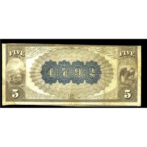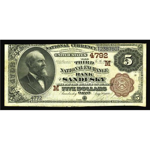 <B>Sandusky, OH</B></I> - $5 1882 Brown Back Fr. 472 <B>The Third National Exchange Bank </B></I> Ch. # (M)4792<BR>This bank was chartered in 1892 and began its emissions with the Brown Back design type. Tonight's offering is an addition to the census and its emergence from the shadows brings the total of its denomination and type now documented to only three. It grades <B>Very Fine,</B></I> but the top to bottom centering is somewhat off, resulting in the top margin being slightly cut in and a tiny portion of the note below showing. Its scarcity should carry it to somewhere between...