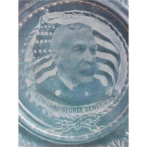 This antique plate is an important example of Early American glass with historical themes, bearing a white transfer portrait of Admiral George Dewey, the wildly popular conquering hero of the Spanish-American War who was named full Admiral of the Navy in 1899. Produced at that time, this plate is clear glass with double pierced edge of eyelet and heart design closely related to the Sandwich Glass George Washington cup plate. Dewey plate is 5-1/2 inch diameter (photographed on blue paper to show the white transfer). Illustrated as #392 in Lindsay book "American Historical Glass." Perfect condition, a prize for a historical glass collection.