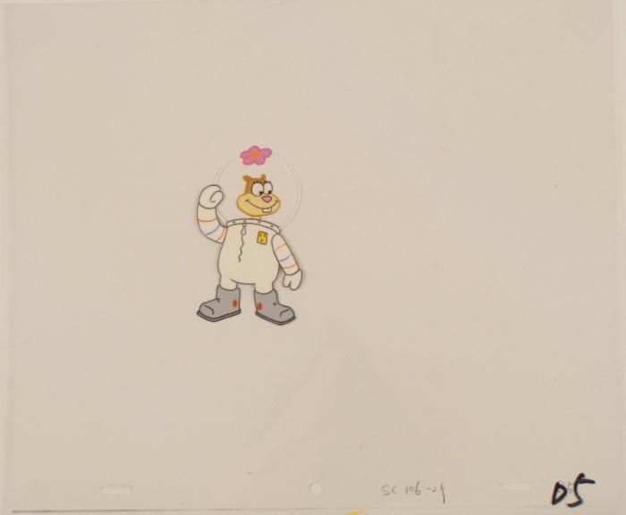 This original animation cel is from the Nickelodeon TV show SpongeBob Squarepants. The story takes place under the deep blue sea in Bikini Bottom, where SpongeBob resides. SpongeBob, who is a yellow, porous sponge, is your typical happy-go-lucky character, as he is always cheerful and enjoys making people laugh. Patrick Star, SpongeBob's neighbor who is a starfish, is your average children's show idiot, as he boasts knowing nothing and is often getting himself into ridiculous situations. Between the homes of these two lies the home of the miserable Squidward, a squid, who is known for being grouchy and playing tricks on SpongeBob and Patrick. Both SpongeBob and Squidward work at the Krusty Krab, a fast food business run by the greedy money-loving Mr. Krabs, a crab, the arch rival of the evil, possibly misunderstood, Plankton. Another neighbor, Sandy Cheeks, an athletic squirrel who normally wears an astronaut's space suit, was introduced in "Tea at the Treedome." She spends most of her time inventing and experimenting. Sandy has her arm up.Original Production Animated Cel Overall Size of Cel: 10 1/2" x 12 1/2" Very Good ConditionThis is an original hand-painted cel set-up used in the production of an episode of "SpongeBob SquarePants." Each one-of-a-kind set-up represents a slight change in position of the characters. When individually photographed and projected in rapid succession, the images appear to move.