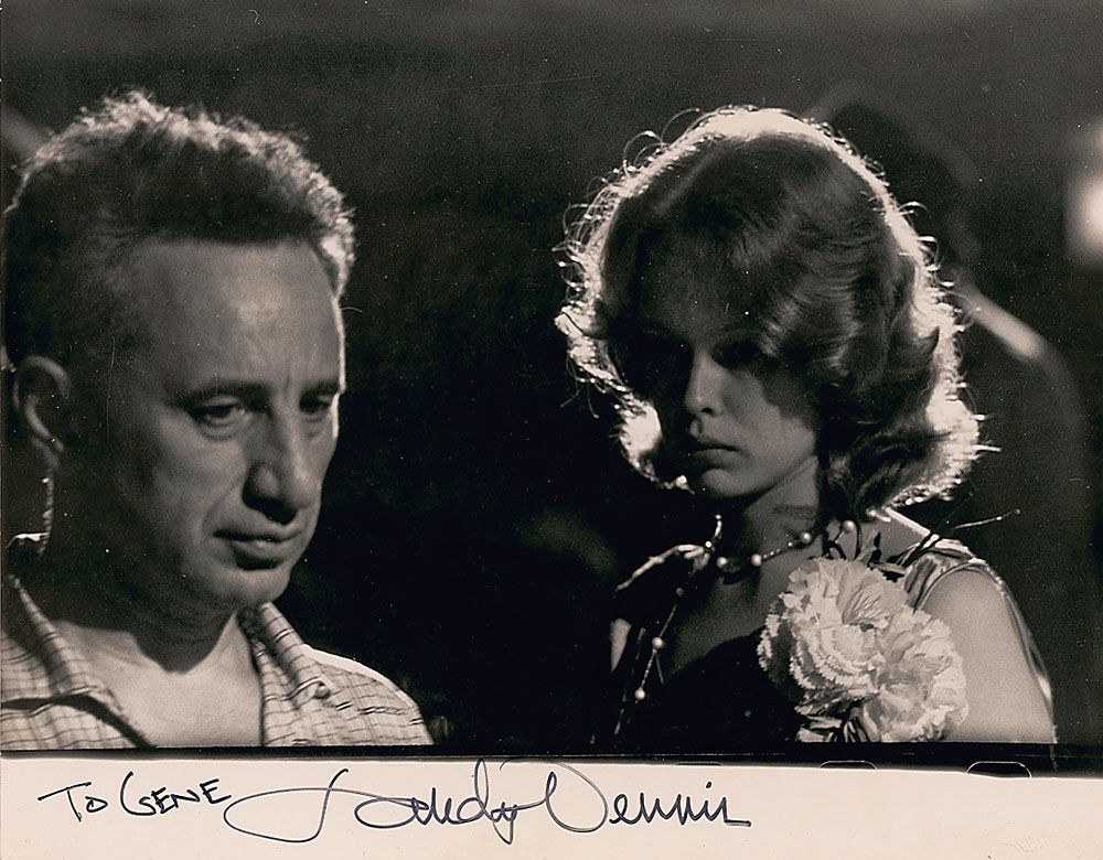 Glossy 13.75 x 10.75 photo of Dennis as she appeared in Splendor in the Grass with director Elia Kazan, signed and inscribed in the lower border in black felt tip, “To Gene, Sandy Dennis.” In fine condition, with a few surface creases.