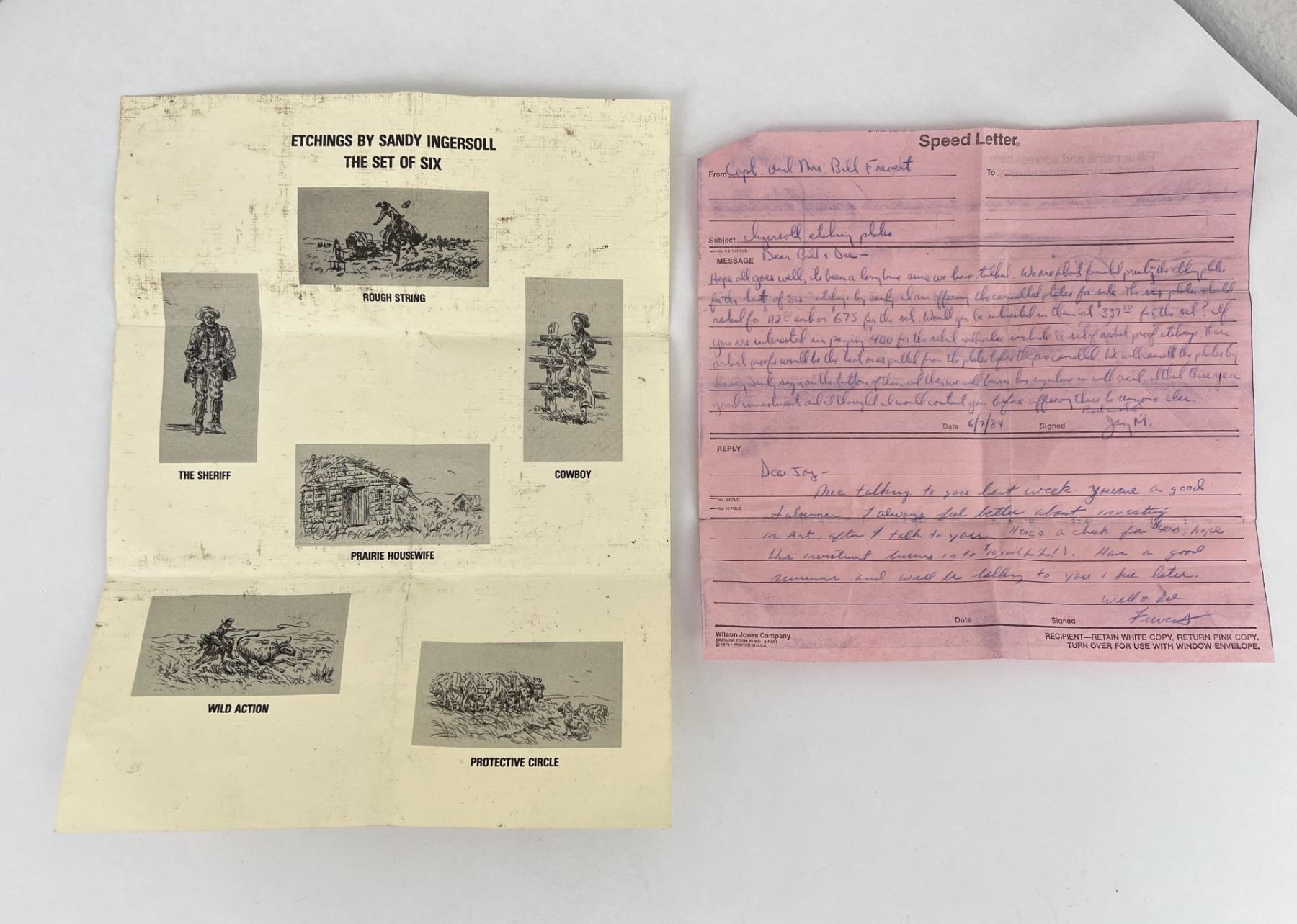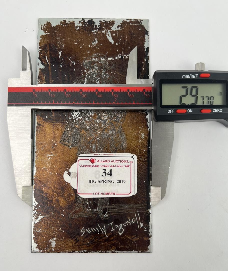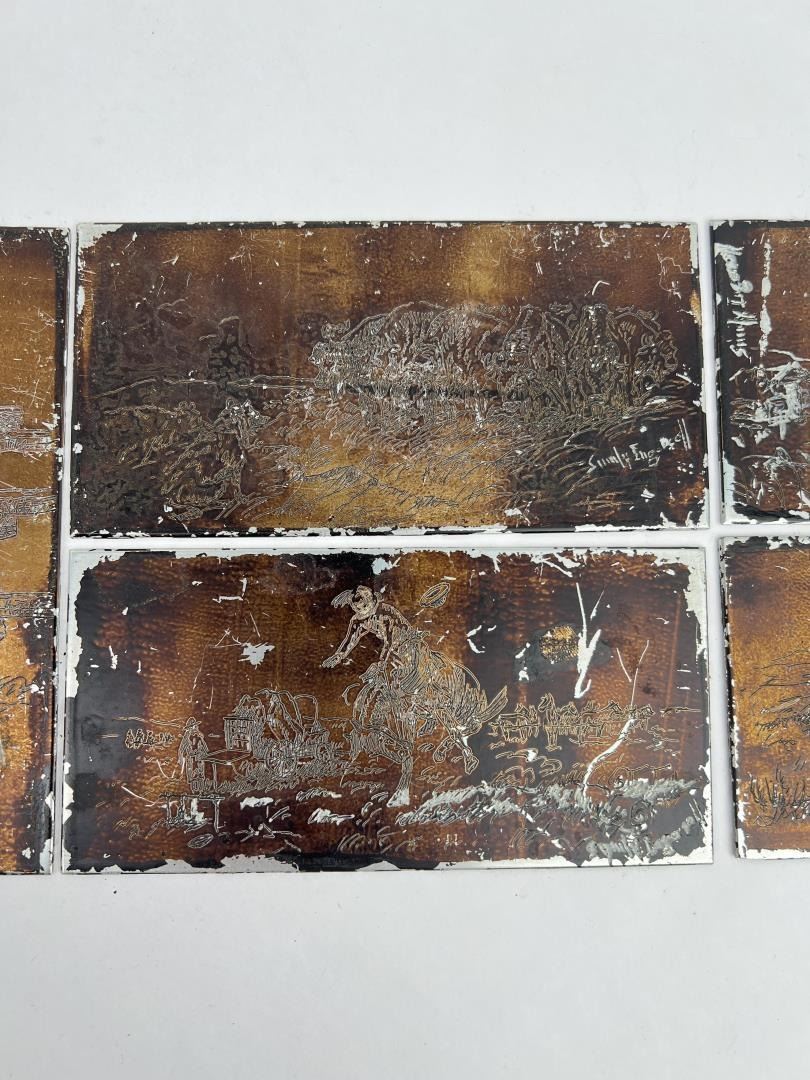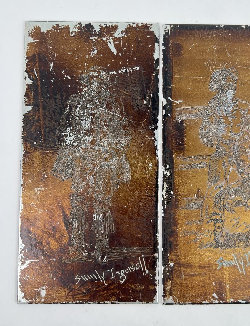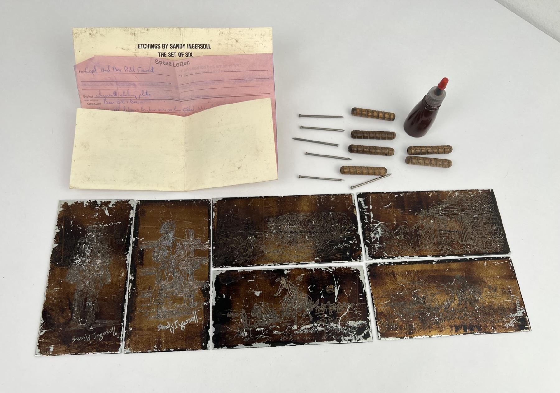 Wonderful grouping of plates. Original as made by Sandy Ingersoll. Total of 6 plates. Each is 3" by 6". Sandy Ingersoll (1908 - 1989) was active/lived in Montana. Sandy Ingersoll is known for Native American, cowboy genre, animal. Sandy Ingersoll was born in Canyon Ferry, Montana and spent most of his life living in the Bitterroot Valley in western Montana. His family was among the original settlers that came to Montana when it was a territory. Sandy's grandfather was an early Helena physician and his father drove stagecoach. As a youth Sandy worked for several cattle outfits in western Montana. Many of these experiences became subjects for later art work. In 1928 Sandy graduated from Florence (Montana) High School, after which he worked for a logging company. In 1929 he married Lola James and worked on a Montana farm during the Depression. He and Lola moved briefly to Yakima, Washington so he could practice commercial art. This career was short lived and they moved back to western Montana where he returned to farm and cattle work. Up to this point, he was primarily a self-taught artist. In the 1930s he spent four years studying art through correspondence courses. In the early 1940s he went to Great Falls to learn sign painting. (Due to a kidney disorder he was not eligible for military service during World War II.) In Great Falls he studied under O. C. Seltzer. He found Seltzer a demanding taskmaster but one who is credited with teaching him the finer points of drawing and painting. Eventually settling in Stevensville, Montana, Ingersoll became a full-time artist in 1962. He supplemented his income by running a small print shop and teaching art classes. Although Ingersoll produced art for over 60 years his total output was not very large. He was a relatively slow artist who spent much of his time laboring over each piece. Ingersoll produced serigraphs, drawings, watercolors and oils. In his later years he produced drypoints and etchings. His themes are mostly Native Americans and cowboys set in central and western Montana. Allard Auction Collection Inv: EDD 45757