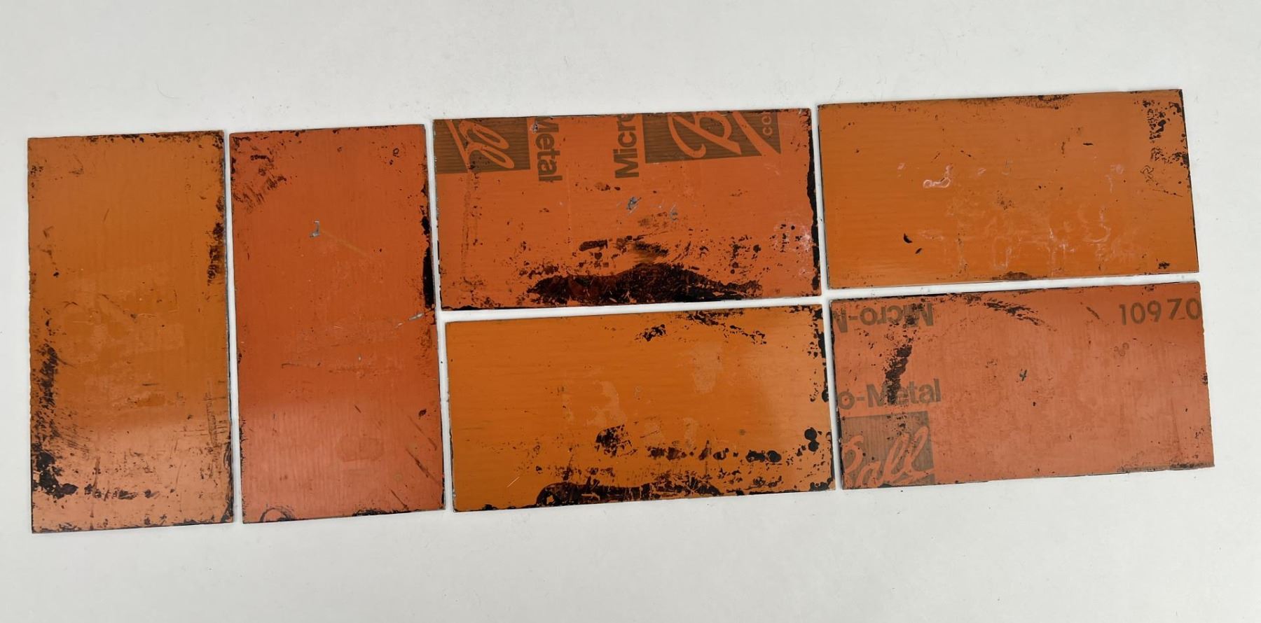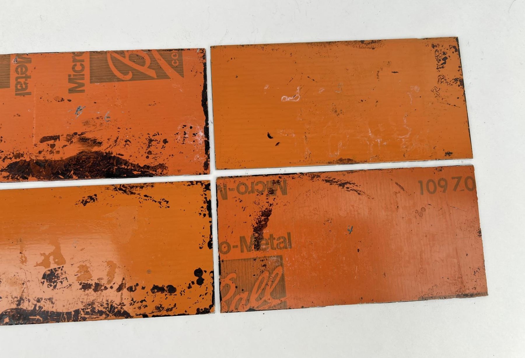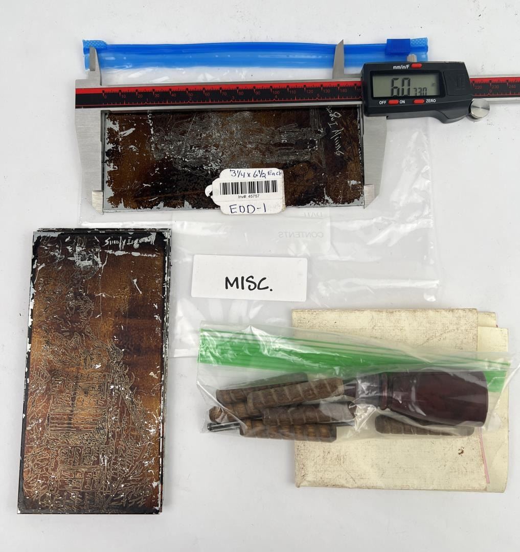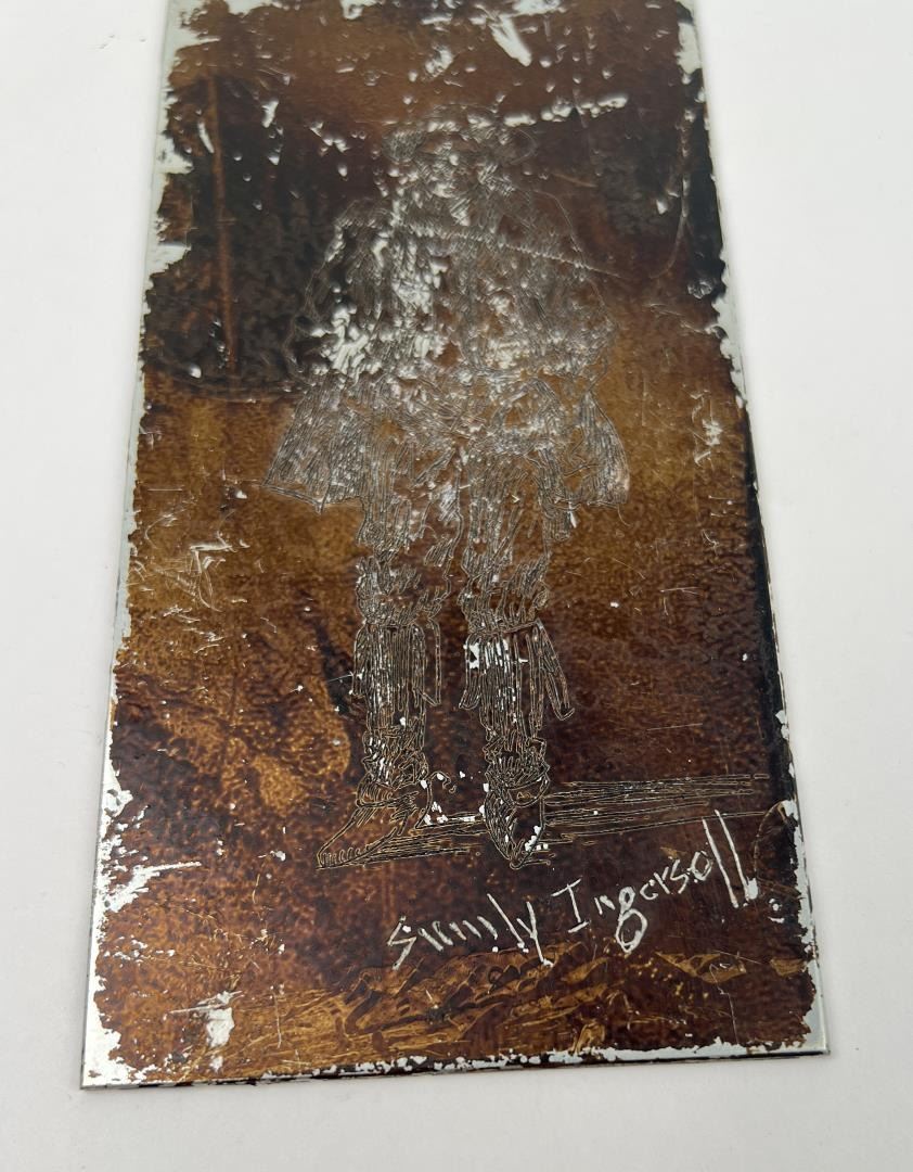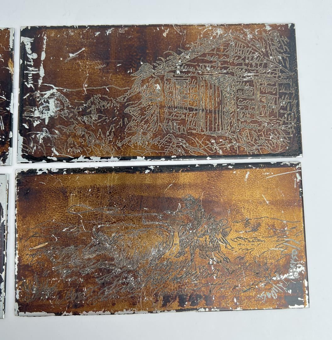 Wonderful grouping of plates. Original as made by Sandy Ingersoll. Total of 6 plates. Each is 3" by 6". Sandy Ingersoll (1908 - 1989) was active/lived in Montana. Sandy Ingersoll is known for Native American, cowboy genre, animal. Sandy Ingersoll was born in Canyon Ferry, Montana and spent most of his life living in the Bitterroot Valley in western Montana. His family was among the original settlers that came to Montana when it was a territory. Sandy's grandfather was an early Helena physician and his father drove stagecoach. As a youth Sandy worked for several cattle outfits in western Montana. Many of these experiences became subjects for later art work. In 1928 Sandy graduated from Florence (Montana) High School, after which he worked for a logging company. In 1929 he married Lola James and worked on a Montana farm during the Depression. He and Lola moved briefly to Yakima, Washington so he could practice commercial art. This career was short lived and they moved back to western Montana where he returned to farm and cattle work. Up to this point, he was primarily a self-taught artist. In the 1930s he spent four years studying art through correspondence courses. In the early 1940s he went to Great Falls to learn sign painting. (Due to a kidney disorder he was not eligible for military service during World War II.) In Great Falls he studied under O. C. Seltzer. He found Seltzer a demanding taskmaster but one who is credited with teaching him the finer points of drawing and painting. Eventually settling in Stevensville, Montana, Ingersoll became a full-time artist in 1962. He supplemented his income by running a small print shop and teaching art classes. Although Ingersoll produced art for over 60 years his total output was not very large. He was a relatively slow artist who spent much of his time laboring over each piece. Ingersoll produced serigraphs, drawings, watercolors and oils. In his later years he produced drypoints and etchings. His themes are mostly Native Americans and cowboys set in central and western Montana. Allard Auction Collection Inv: EDD 45757