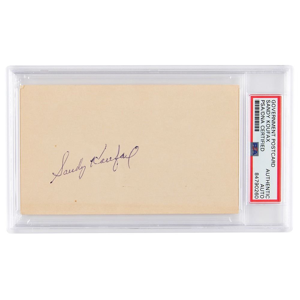 Vintage ballpoint signature, "Sandy Koufax,& rdquo; on the reverse of an off-white 5.5 x 3.25 government postcard postmarked July 19, 1965. In very fine condition. Encapsulated in a PSA/DNA authentication holder.