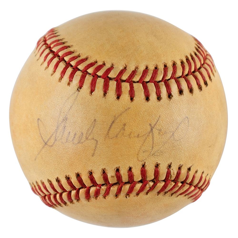 Official Rawlings National League (Feeney) baseball signed in ballpoint on the sweet spot by Sandy Koufax. In very good condition, with overall toning and soiling, and a PSA label affixed to a rear panel (certificate of authenticity not present).