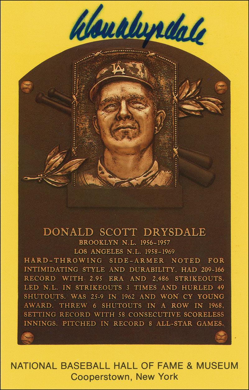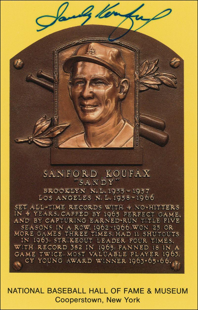 Two gold Hall of Fame plaque cards signed in blue felt tip by Don Drysdale and Sandy Koufax, respectively. Some light haloing and the emulsion has been erased at the top of the Drysdale card to allow the ink to adhere, otherwise fine condition.