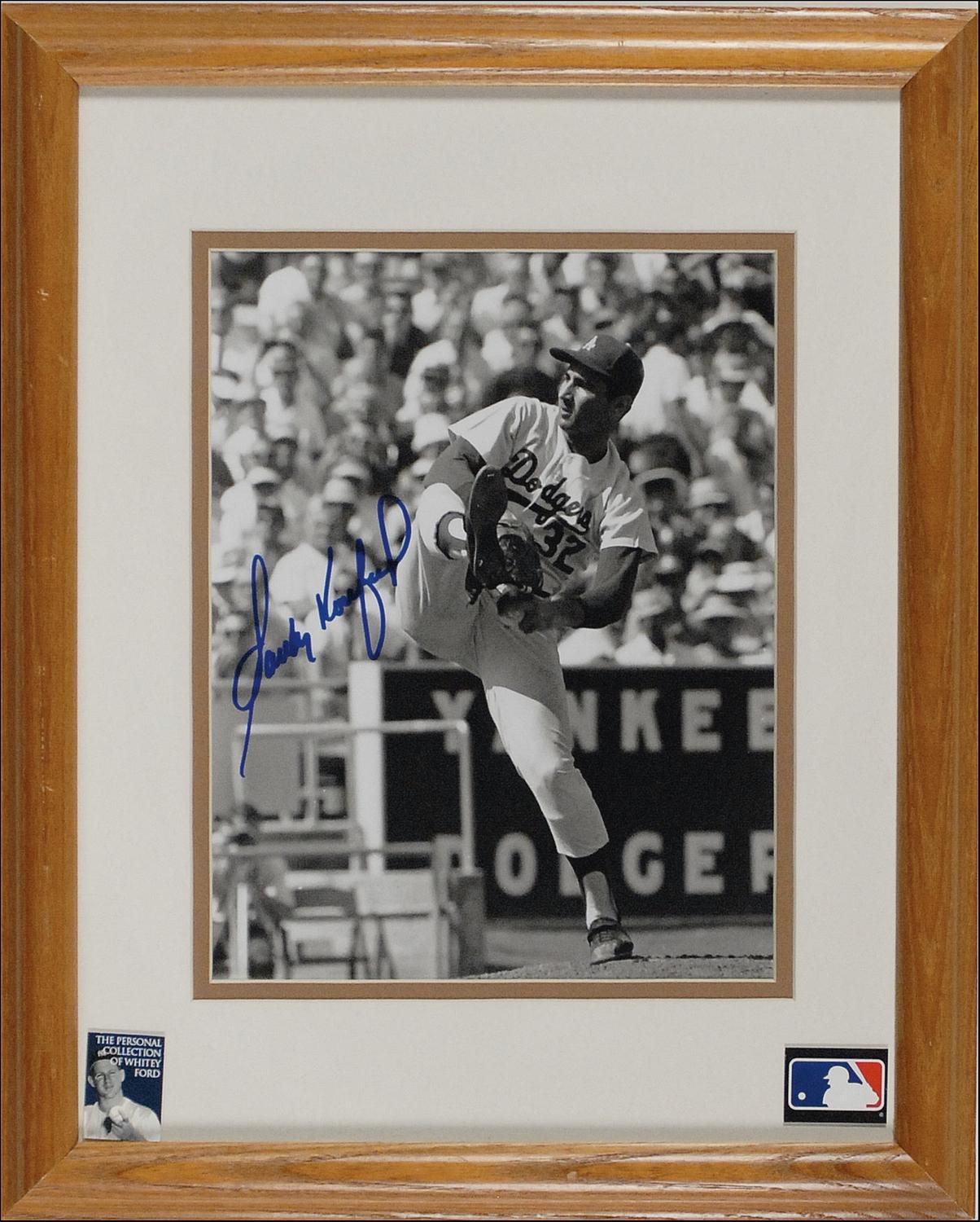 Glossy 7.25 x 9.5 photo of Koufax on the mound for the Dodgers in a game against the Yankees, signed in blue felt tip “Sandy Koufax.” Double-matted and framed to an overall size of 12.75 x 16. In fine condition. Photo was originally acquired from Ford’s personal collection.
