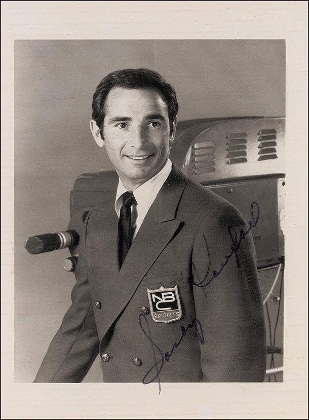 Vintage 5 x 7 semi-glossy photo of Koufax in his NBC sports blazer, signed in black felt tip. Scattered creases and surface marks, a few dings over beginning of signature, and a James Spence authentication label affixed to lower corner of reverse, otherwise fine condition. In 1967, Koufax signed a ten-year contract with NBC for one million dollars to be a broadcaster on the Saturday Game of the Week. Accompanied by a letter of authenticity from James Spence.