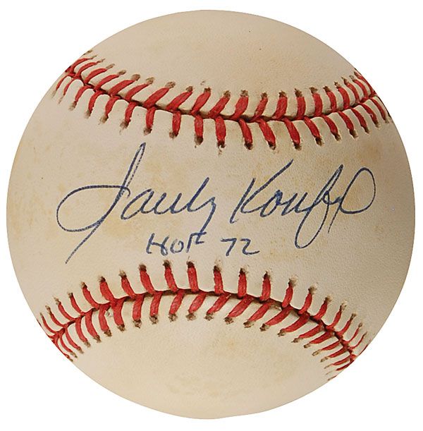 Official Rawlings National League baseball signed in blue ballpoint on the sweet spot, “Sandy Koufax, HOF 72.” Moderate scattered toning and a a PSA/DNA label affixed to a reverse side panel, otherwise fine condition. Accompanied by a full letter of authenticity from PSA/DNA.