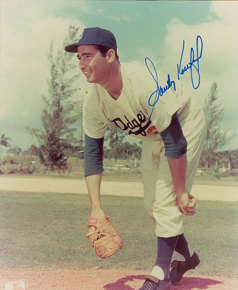 Color glossy 8 x 10 photo of Koufax on the mound in his Brooklyn Dodgers uniform, signed in blue felt tip. In very fine condition.