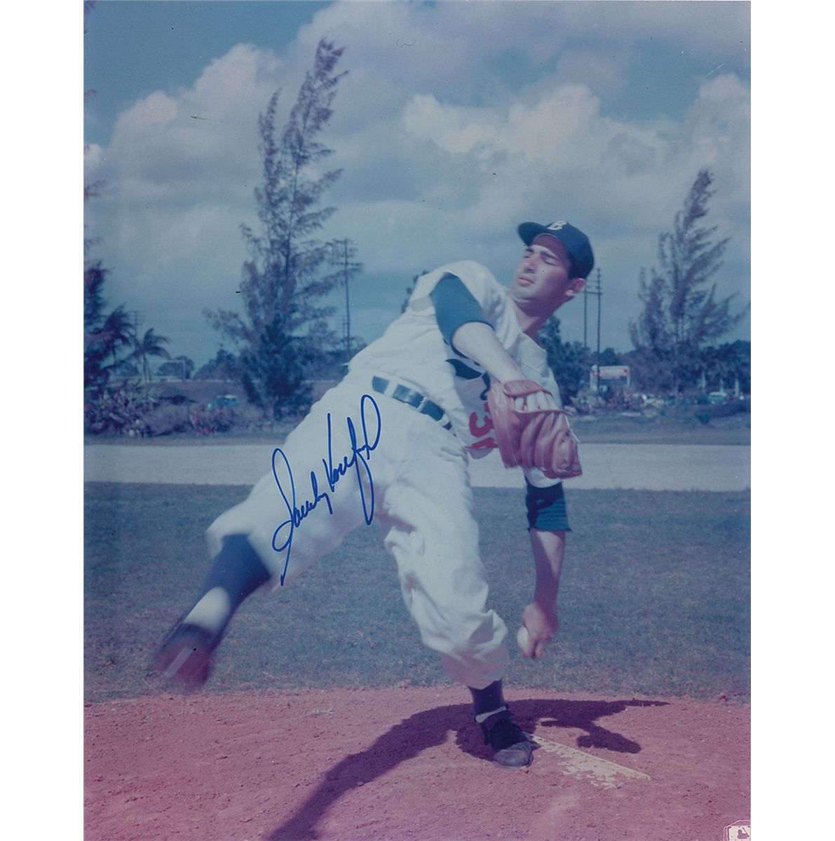 Color 8 x 10 photo of Koufax rearing back on the mound, signed in blue felt tip. In fine condition.
