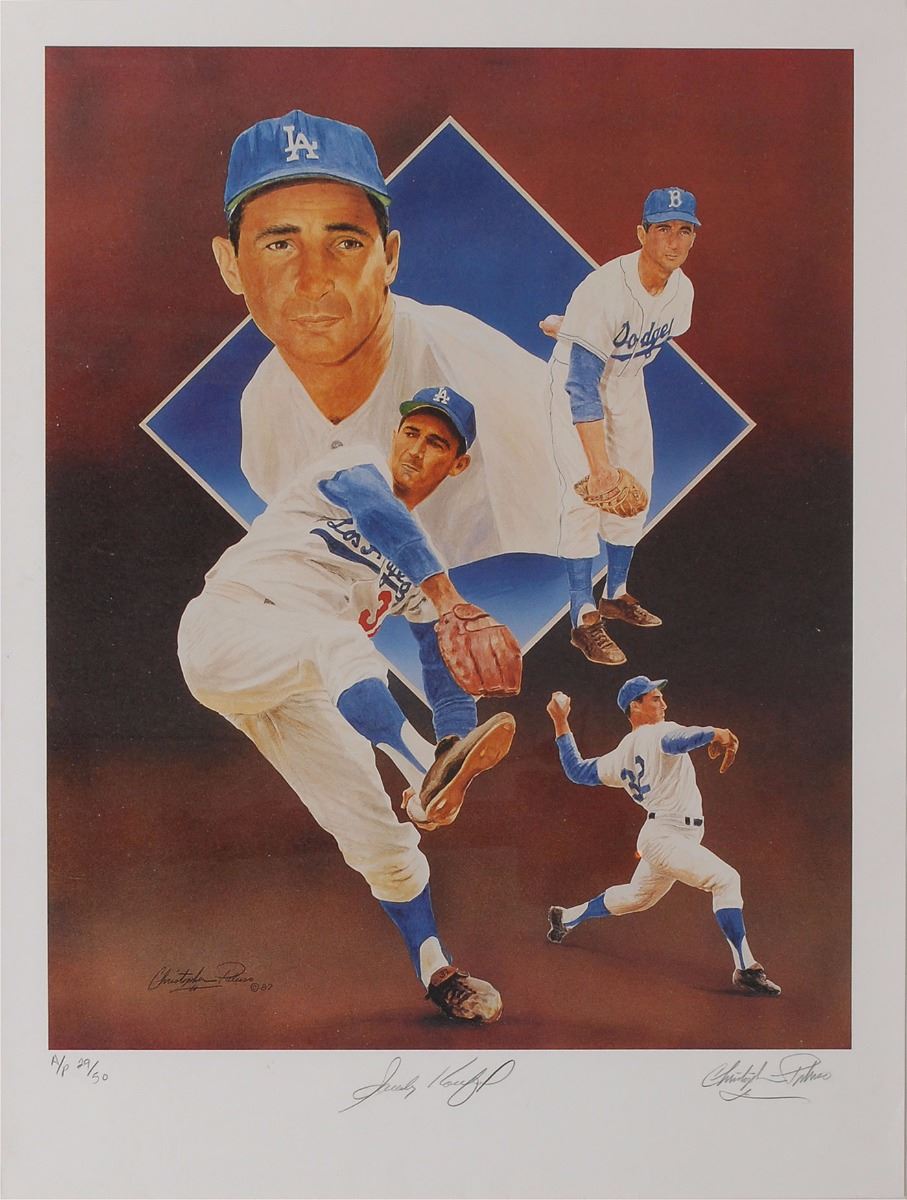 Color limited edition 18 x 24 lithograph of a painting entitled ‘Sandy Koufax,’ showing the legendary Dodgers hurler in four different poses, numbered AP 29/50, signed in the lower border in pencil by Koufax. Also signed in pencil by the artist, Christopher Paluso. Rolled and in fine condition, with a light vertical bend across the lower half of the print.