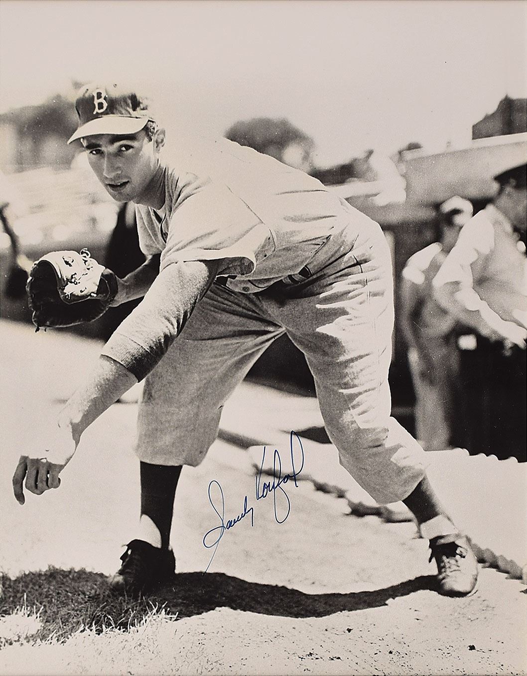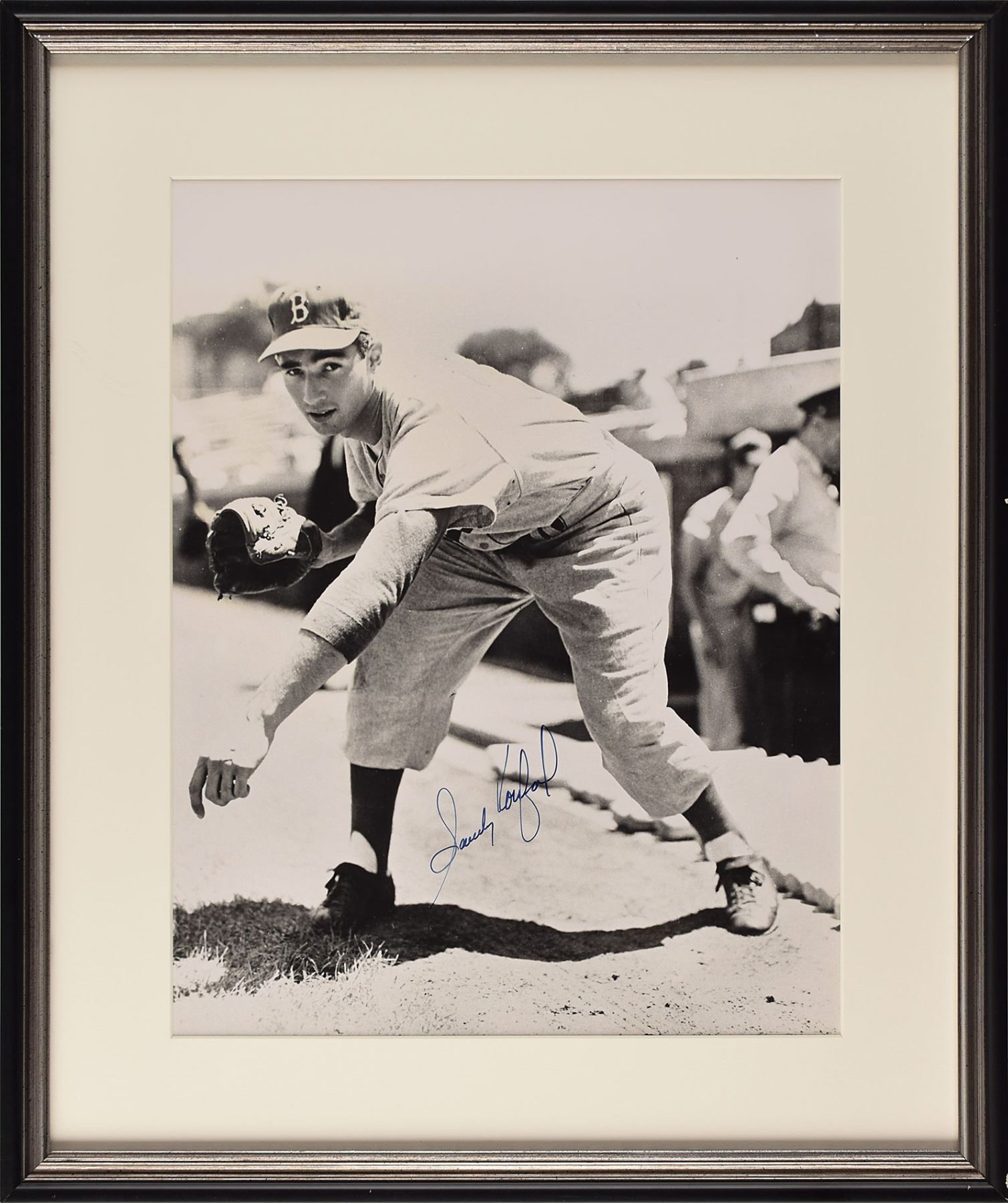 Superb satin-finish 10.5 x 13.5 photo of Koufax early in his career with the Brooklyn Dodgers, neatly signed in blue felt tip. Matted and framed to an overall size of 16 x 19. In fine condition. A wonderful, early image of the legendary southpaw.