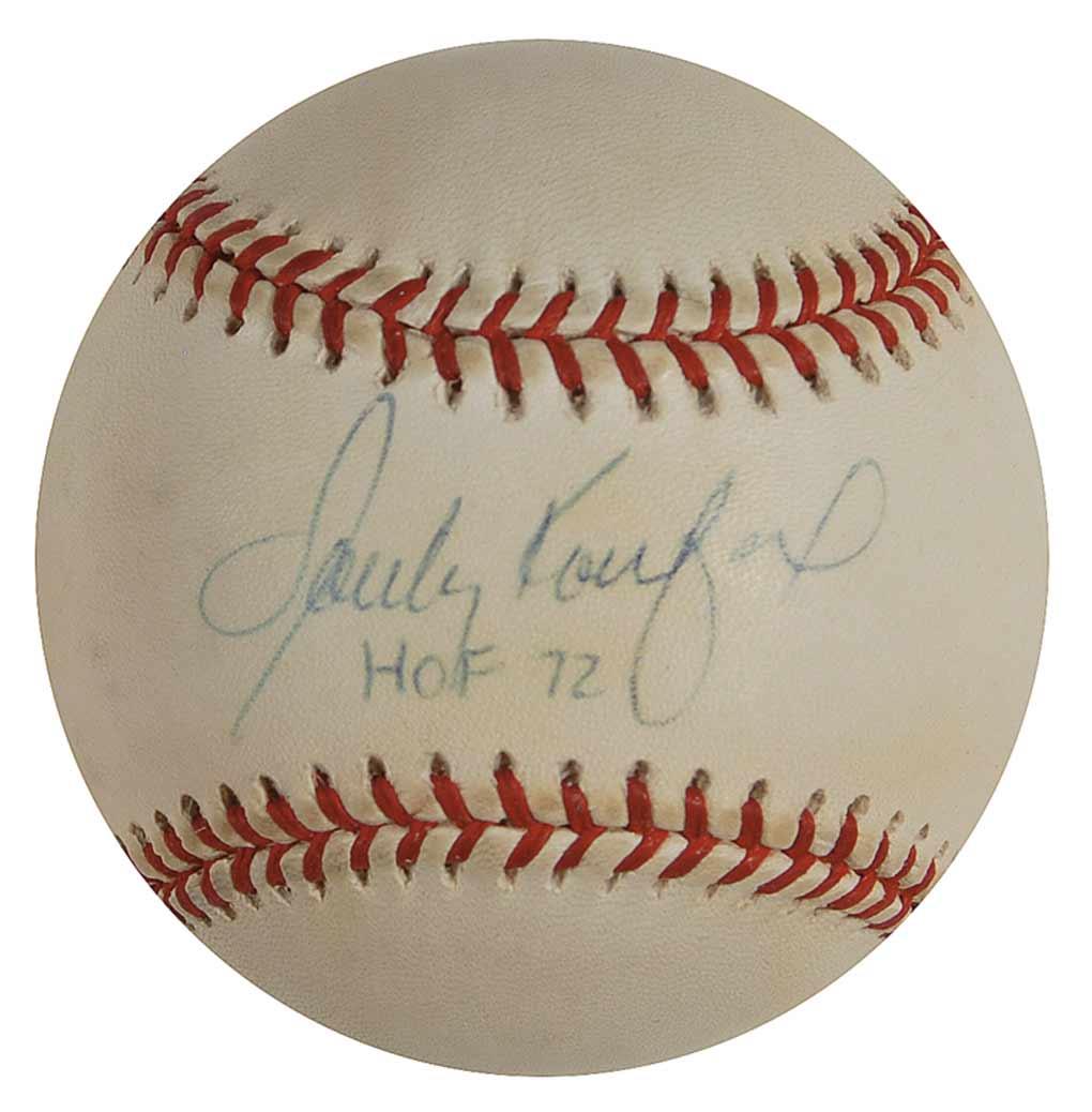 Official Rawlings National League baseball signed in blue ballpoint on the sweet spot, “Sandy Koufax HOF 72.” A Steiner hologram affixed to ball, mild overall shade of toning, and a bit of slight spreading of ink resulting in a slightly fuzzy appearance, otherwise fine condition.