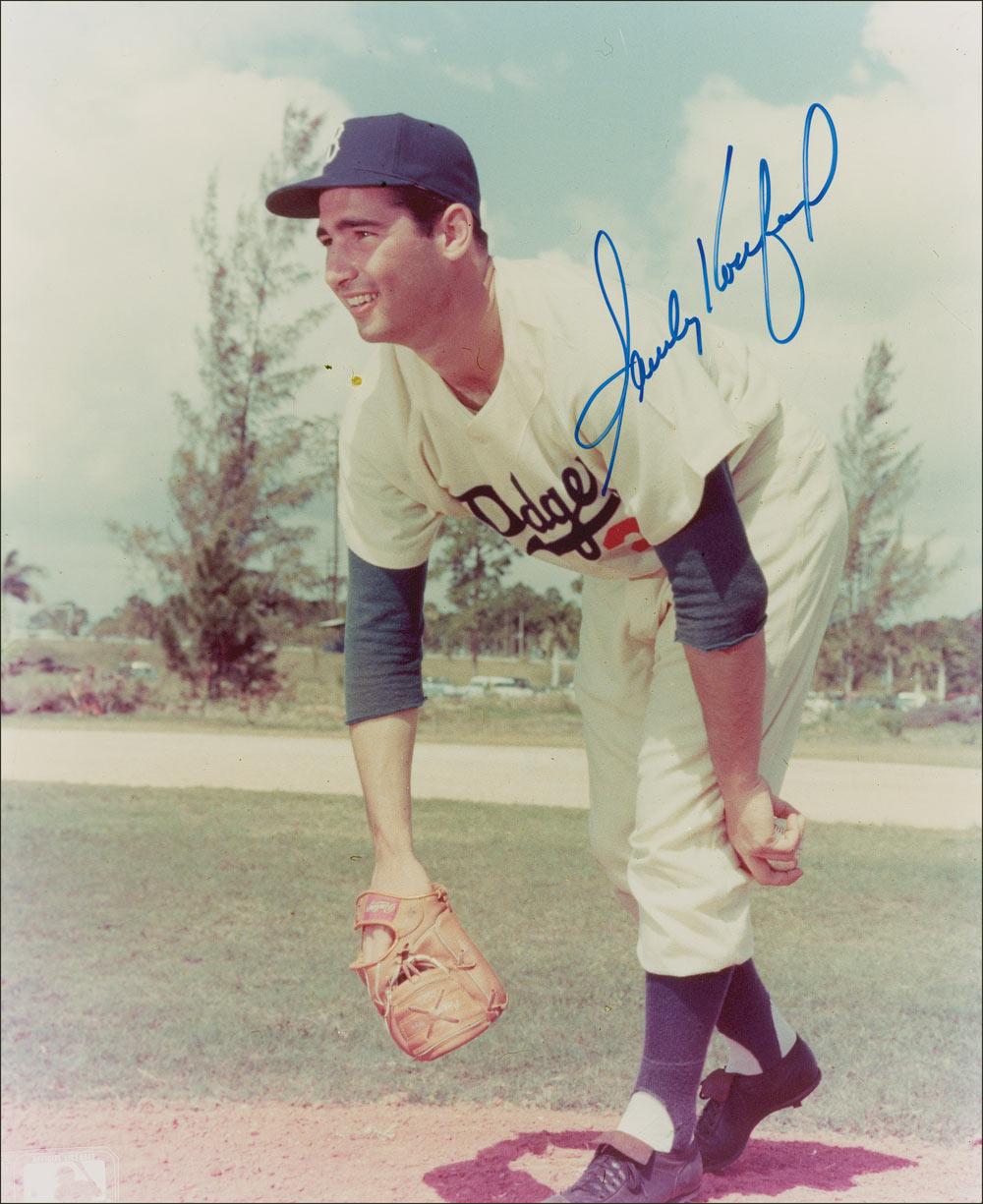 Color glossy 8 x 10 photo of Koufax on the mound in his Brooklyn Dodgers uniform, signed in blue felt tip. In fine condition, with a few scattered edge creases.