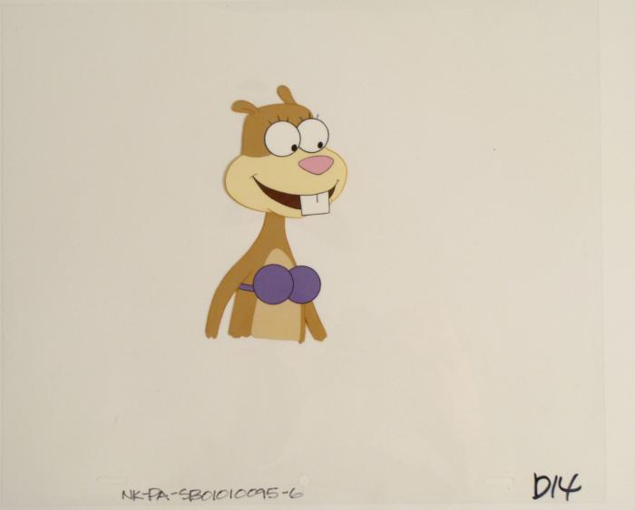 This original animation cel is from the Nickelodeon TV show SpongeBob Squarepants. The story takes place under the deep blue sea in Bikini Bottom, where SpongeBob resides. SpongeBob, who is a yellow, porous sponge, is your typical happy-go-lucky character, as he is always cheerful and enjoys making people laugh. Patrick Star, SpongeBob's neighbor who is a starfish, is your average children's show idiot, as he boasts knowing nothing and is often getting himself into ridiculous situations. Between the homes of these two lies the home of the miserable Squidward, a squid, who is known for being grouchy and playing tricks on SpongeBob and Patrick. Both SpongeBob and Squidward work at the Krusty Krab, a fast food business run by the greedy money-loving Mr. Krabs, a crab, the arch rival of the evil, possibly misunderstood, Plankton. Another neighbor, Sandy Cheeks, an athletic squirrel who normally wears an astronaut's space suit, was introduced in "Tea at the Treedome." She spends most of her time inventing and experimenting. Sandy Cheeks has a big toothOriginal Production Animated Cel Overall Size of Cel: 10 1/2" x 12 1/2" Very Good ConditionThis is an original hand-painted cel set-up used in the production of an episode of "SpongeBob SquarePants." Each one-of-a-kind set-up represents a slight change in position of the characters. When individually photographed and projected in rapid succession, the images appear to move.