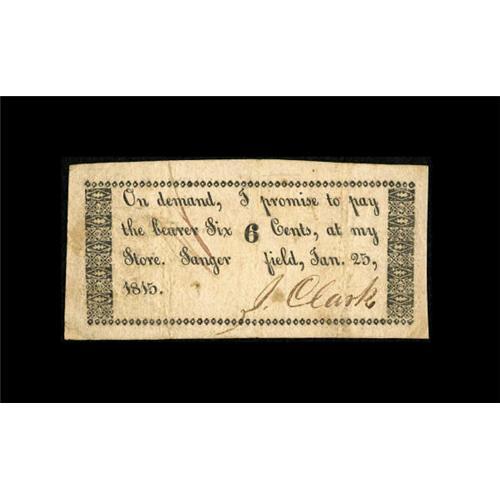<B>Sangerfield, NY- J. Clark</B></I> 6¢ Jan. 25, 1815 Harris 17<BR> A very rare and perhaps unique item, as this is both the Harris plate note and the only denomination listed by Harris for this issuer. <B>Very Fine, </B></I>ex-Harris collection sale, September, 2003. <BR><I>From The Collection of a Louisiana Gentleman.</B></I><BR><BR><b>Shipping:</b> Coins & Currency (<a target="_blank" href="http://www.heritageauctions.com/common/shipping.php">view shipping information</a>)
