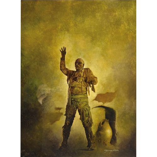<B>Manuel Sanjulian - Famous Monsters of Filmland #185 Cover Original Art (Warren, 1982).</B></I> Manuel Sanjulian, a legendary talent in the field of painted fantasy art, brought his amazing talent for color and light to this sand-swept scene showcasing Im-ho-tep, the Mummy. The final <B>Famous Monsters of Filmland</B></I> cover featured only a cropped view of this magnificent image. This painting has to be seen in its full glory to appreciate the full effect. Sanjulian's vision of the Mummy walking through a smothering sandstorm is infused with a tense mood of mystery. The image area of this painting measures 14" x 19" and the art is in Excellent condition. The piece has been beautifully framed, using a finish that accents the rich colors of this monster-masterpiece. A tearsheet of the cover is also included in this lot.