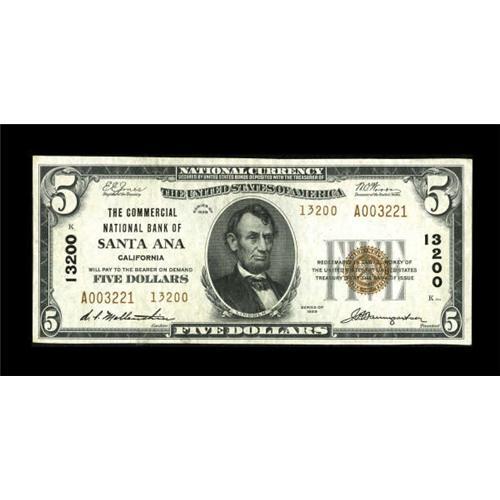 <B>Santa Ana, CA</B></I> - $5 1929 Ty. 2 <B>The Commercial NB</B></I> Ch. # 13200<BR> A bright and exceptionally attractive Series 1929 example from this much collected Orange County community. <B>Extremely Fine.</B></I><BR><BR><b>Shipping:</b> Coins & Currency (<a target="_blank" href="http://www.heritageauctions.com/common/shipping.php">view shipping information</a>)