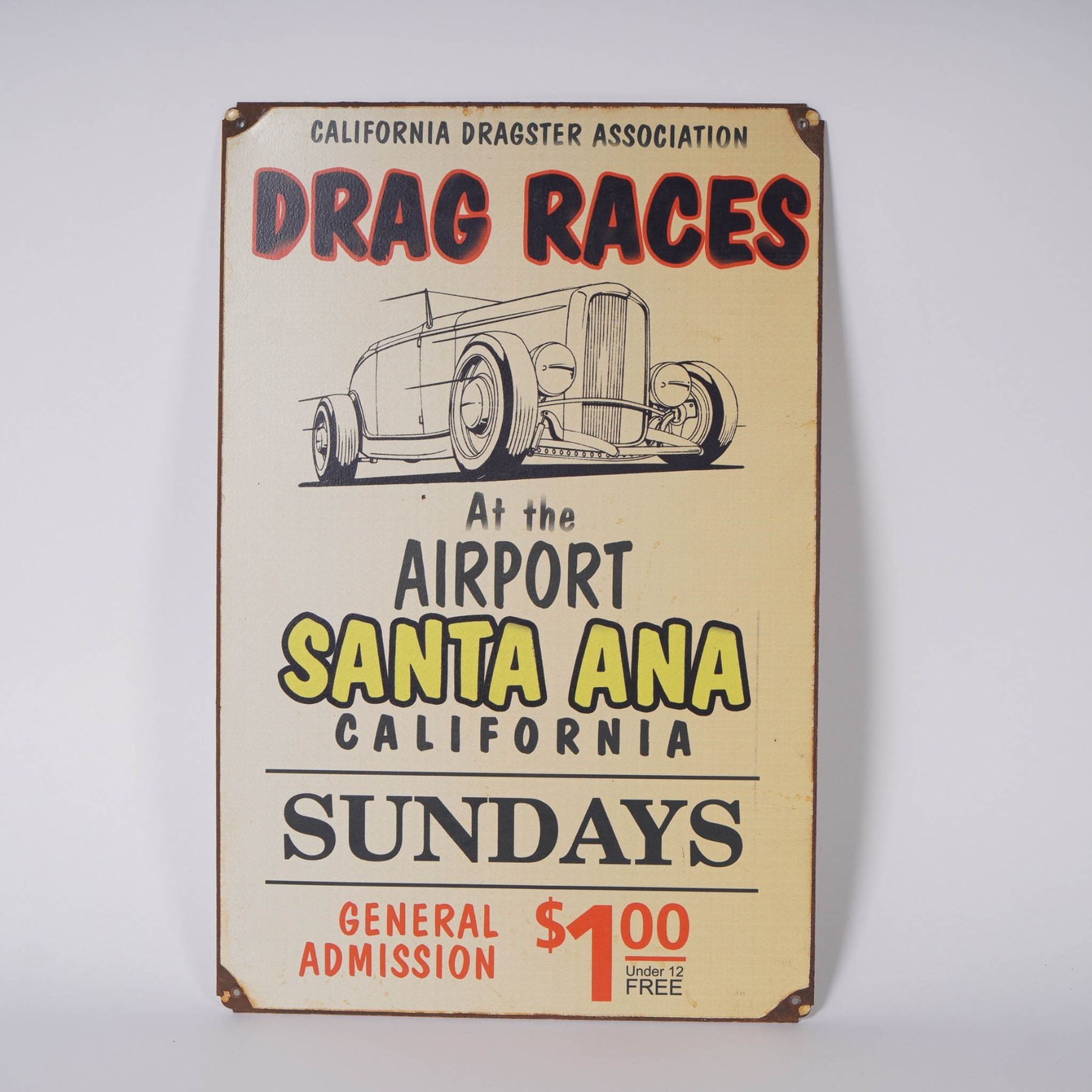 Vintage-style metal advertising sign promoting drag races held by the California Dragster Association at the Santa Ana, California airport. The sign features a bold and colorful design with a black and white hot rod illustration and striking text that reads Drag Races - At the Airport Santa Ana California - Sundays - General Admission $1.00 (Under 12 Free). Likely a reproduction inspired by mid-20th-century automotive event signage, this piece captures the nostalgia of classic Southern California car culture. Finished with a faux-weathered look, the corners are slightly distressed for added retro appeal.